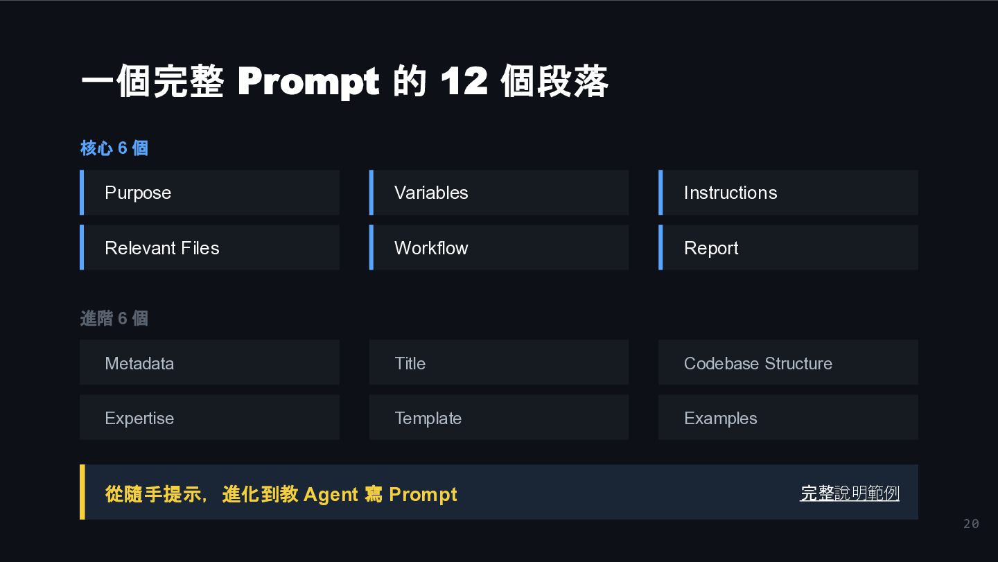 Variables Instructions Relevant Files Workflow Report 進階 6 個 Metadata Title Codebase Structure Expertise Template Examples 從隨手提示,進化到教 Agent 寫 Prompt 完整說明範例