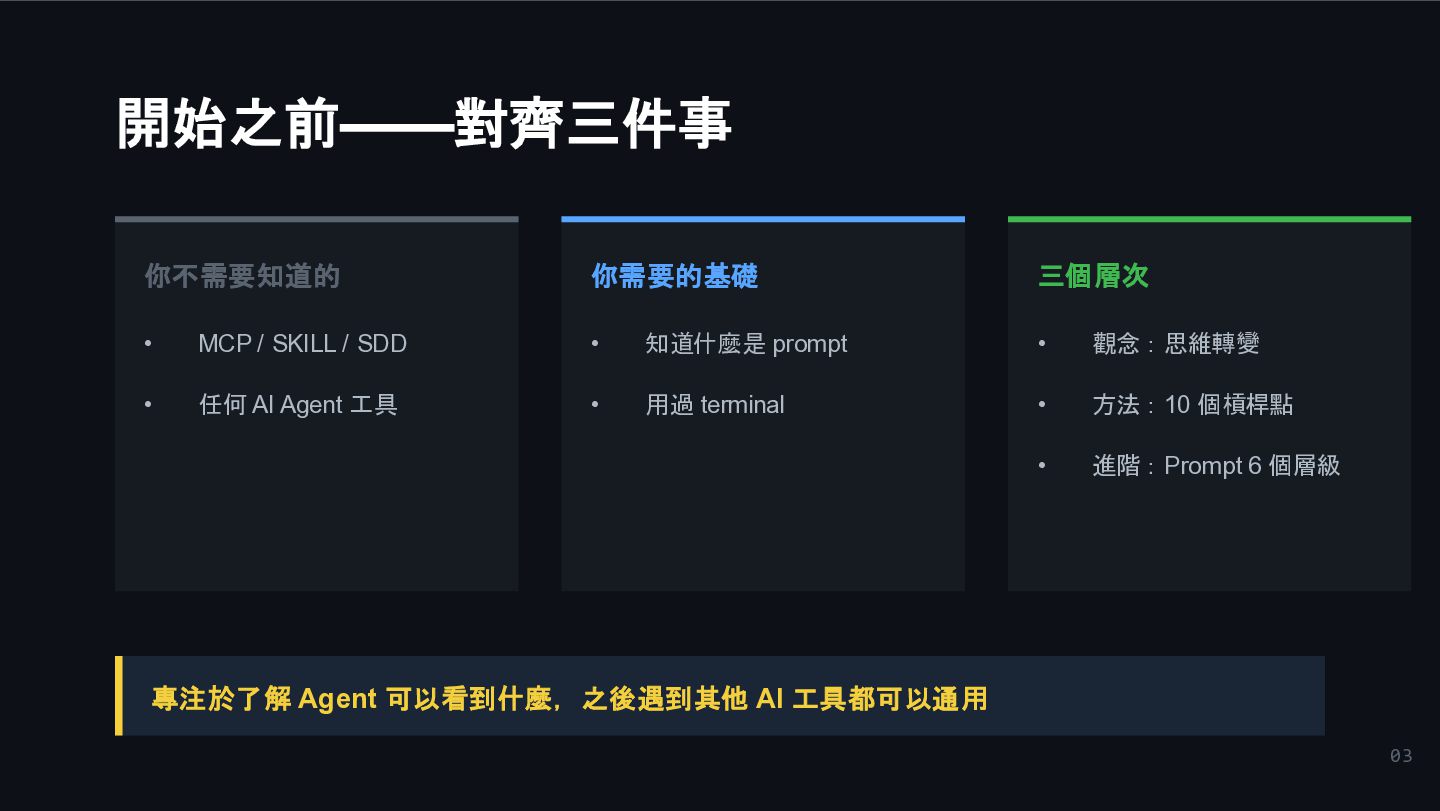 任何 AI Agent 工具 你需要的基礎 • 知道什麼是 prompt • 用過 terminal 三個層次 • 觀念:思維轉變 • 方法:10 個槓桿點 • 進階:Prompt 6 個層級 專注於了解 Agent 可以看到什麼,之後遇到其他 AI 工具都可以通用