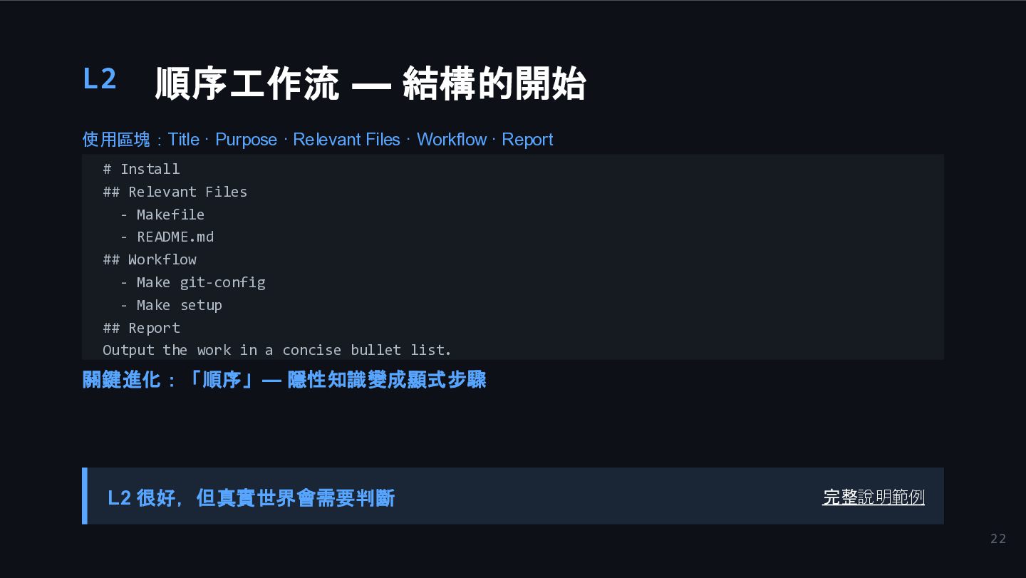 Files · Workflow · Report # Install ## Relevant Files - Makefile - README.md ## Workflow - Make git-config - Make setup ## Report Output the work in a concise bullet list. 關鍵進化:「順序」— 隱性知識變成顯式步驟 L2 很好,但真實世界會需要判斷 完整說明範例