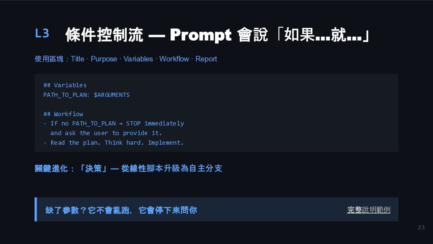 21. 23 L3 條件控制流 — Prompt 會說「如果…就…」 使用區塊:Title · Purpose ·