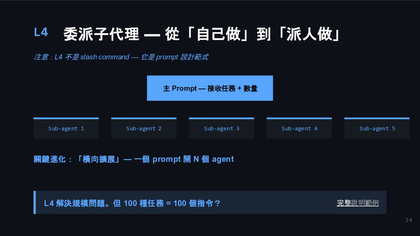 22. 24 L4 委派子代理 — 從「自己做」到「派人做」 注意:L4 不是 slash command —