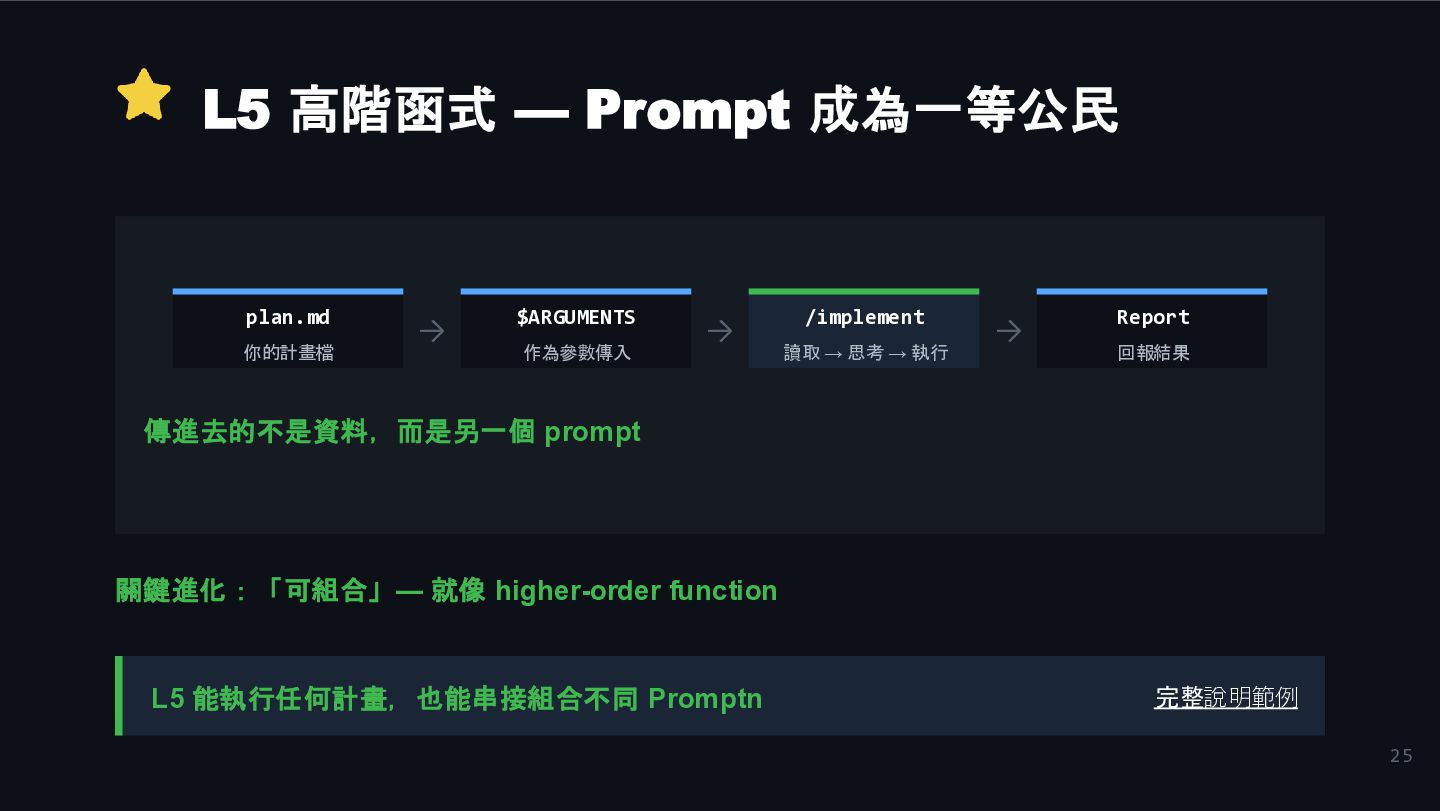 作為參數傳入 → /implement 讀取 → 思考 → 執行 → Report 回報結果 傳進去的不是資料,而是另一個 prompt 關鍵進化:「可組合」— 就像 higher-order function L5 能執行任何計畫,也能串接組合不同 Promptn 完整說明範例