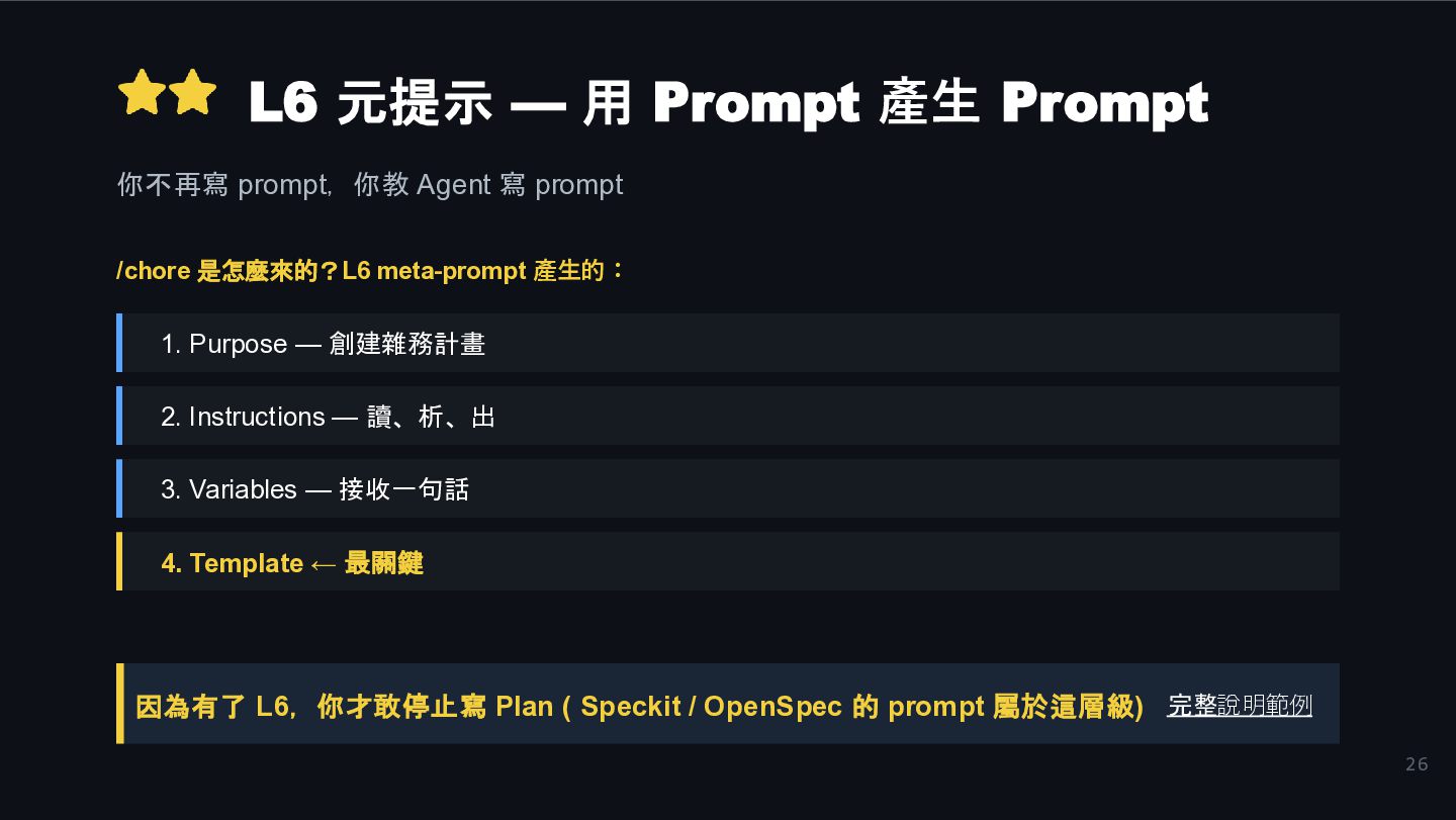 Agent 寫 prompt /chore 是怎麼來的?L6 meta-prompt 產生的: 1. Purpose — 創建雜務計畫 2. Instructions — 讀、析、出 4. Template ← 最關鍵 3. Variables — 接收一句話 因為有了 L6,你才敢停止寫 Plan ( Speckit / OpenSpec 的 prompt 屬於這層級) 完整說明範例