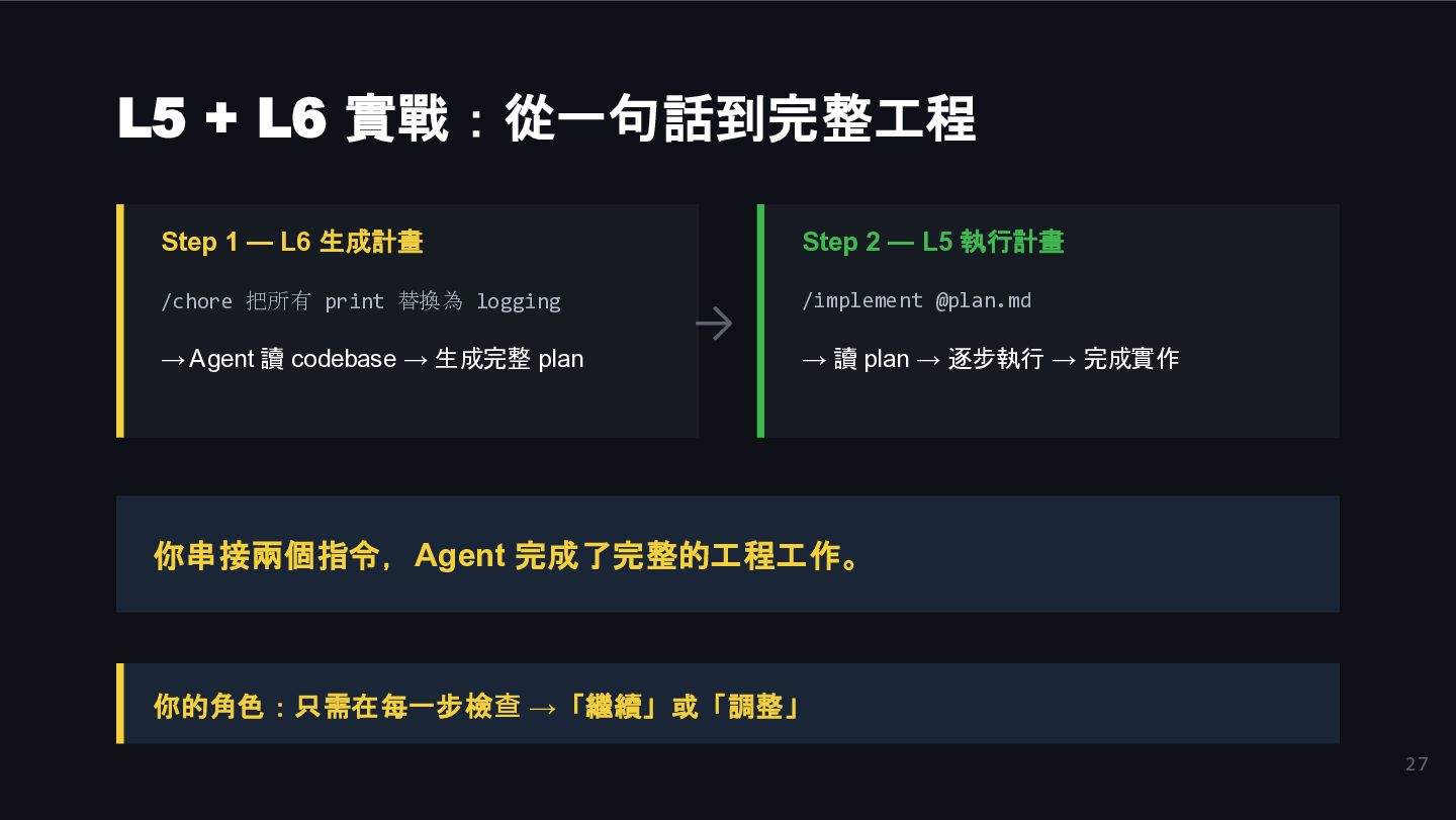 /chore 把所有 print 替換為 logging → Agent 讀 codebase → 生成完整 plan → Step 2 — L5 執行計畫 /implement @plan.md → 讀 plan → 逐步執行 → 完成實作 你串接兩個指令,Agent 完成了完整的工程工作。 你的角色:只需在每一步檢查 →「繼續」或「調整」