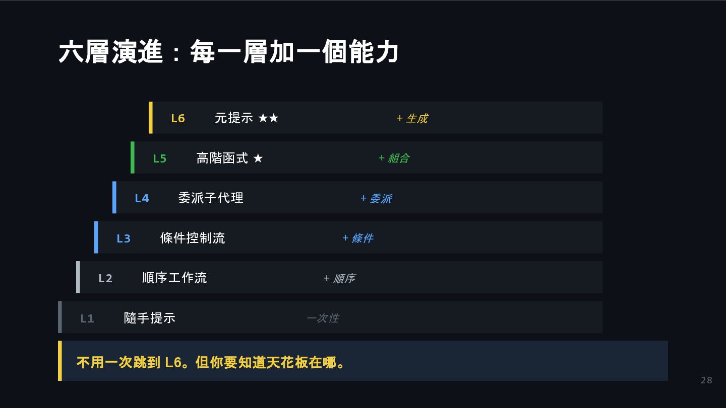 條件控制流 + 條件 L4 委派子代理 + 委派 L5 高階函式 ★ + 組合 L6 元提示 ★★ + 生成 不用一次跳到 L6。但你要知道天花板在哪。