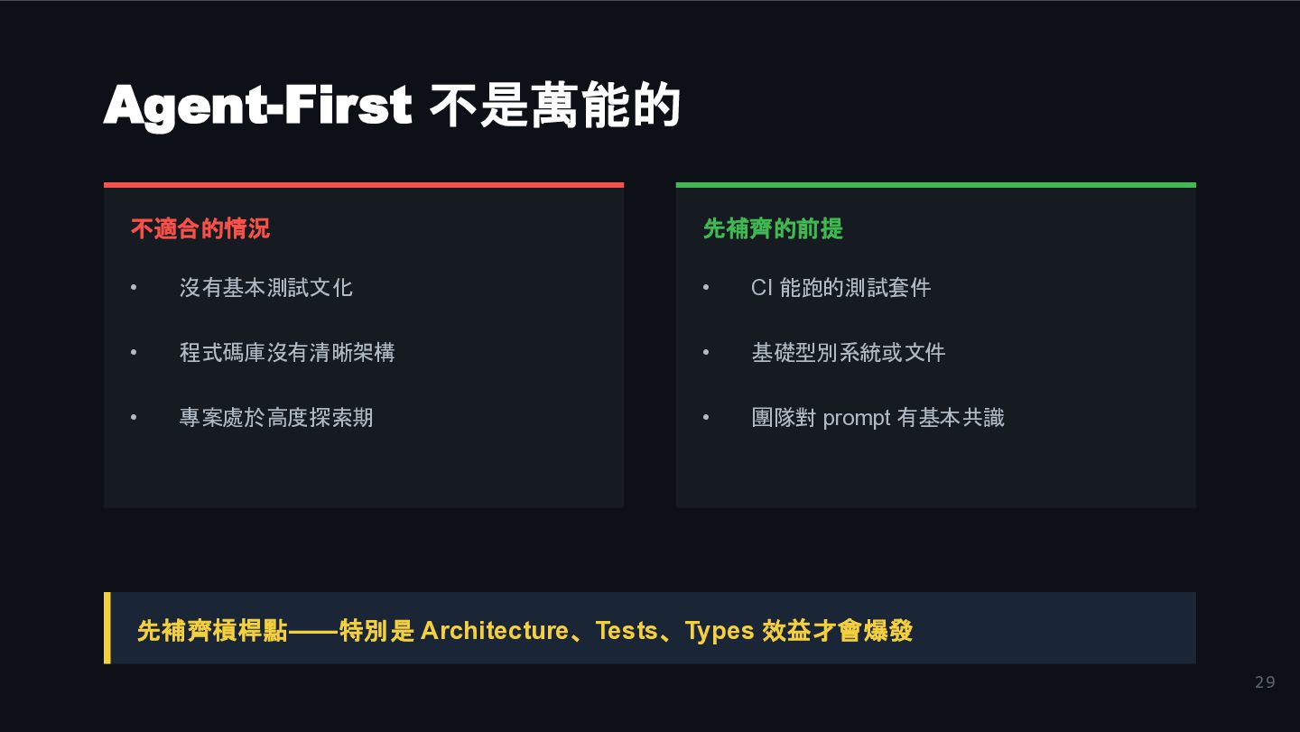 先補齊的前提 • CI 能跑的測試套件 • 基礎型別系統或文件 • 團隊對 prompt 有基本共識 先補齊槓桿點——特別是 Architecture、Tests、Types 效益才會爆發