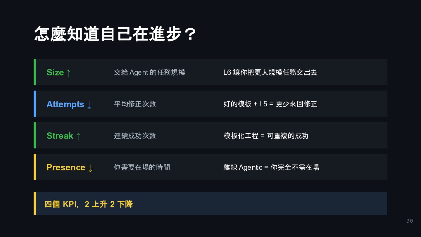 ↓ 平均修正次數 好的模板 + L5 = 更少來回修正 Streak ↑ 連續成功次數 模板化工程 = 可重複的成功 Presence ↓ 你需要在場的時間 離線 Agentic = 你完全不需在場 四個 KPI,2 上升 2 下降