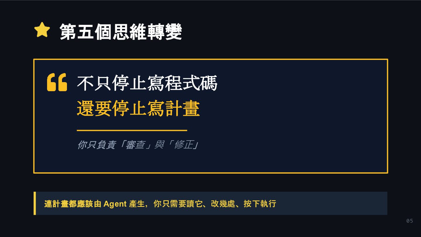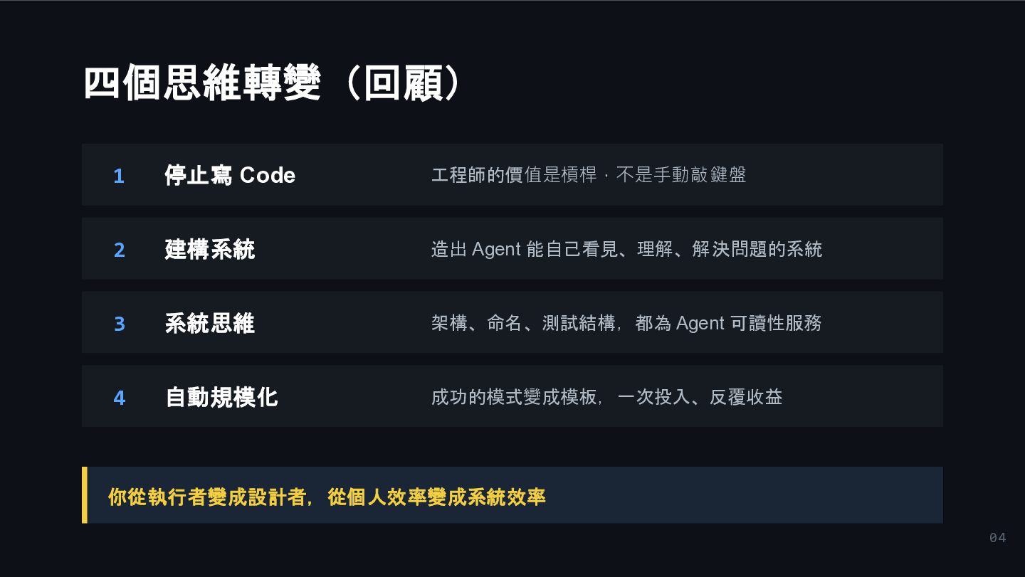 3. 04 四個思維轉變(回顧) 1 停止寫 Code 工程師的價值是槓桿,不是手動敲鍵盤 2 建構系統 造出 Agent