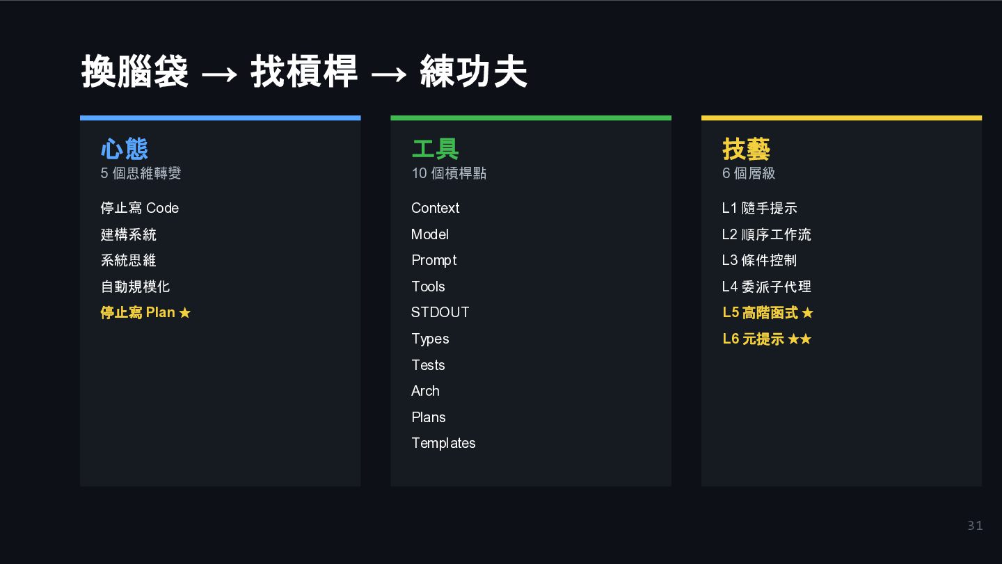Code 建構系統 系統思維 自動規模化 停止寫 Plan ★ 工具 10 個槓桿點 Context Model Prompt Tools STDOUT Types Tests Arch Plans Templates 技藝 6 個層級 L1 隨手提示 L2 順序工作流 L3 條件控制 L4 委派子代理 L5 高階函式 ★ L6 元提示 ★★
