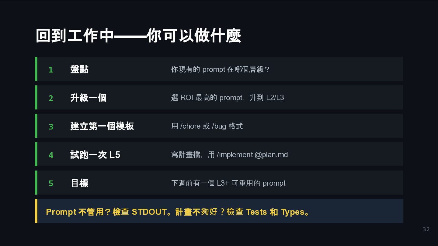 ROI 最高的 prompt,升到 L2/L3 3 建立第一個模板 用 /chore 或 /bug 格式 4 試跑一次 L5 寫計畫檔,用 /implement @plan.md 5 目標 下週前有一個 L3+ 可重用的 prompt Prompt 不管用?檢查 STDOUT。計畫不夠好?檢查 Tests 和 Types。