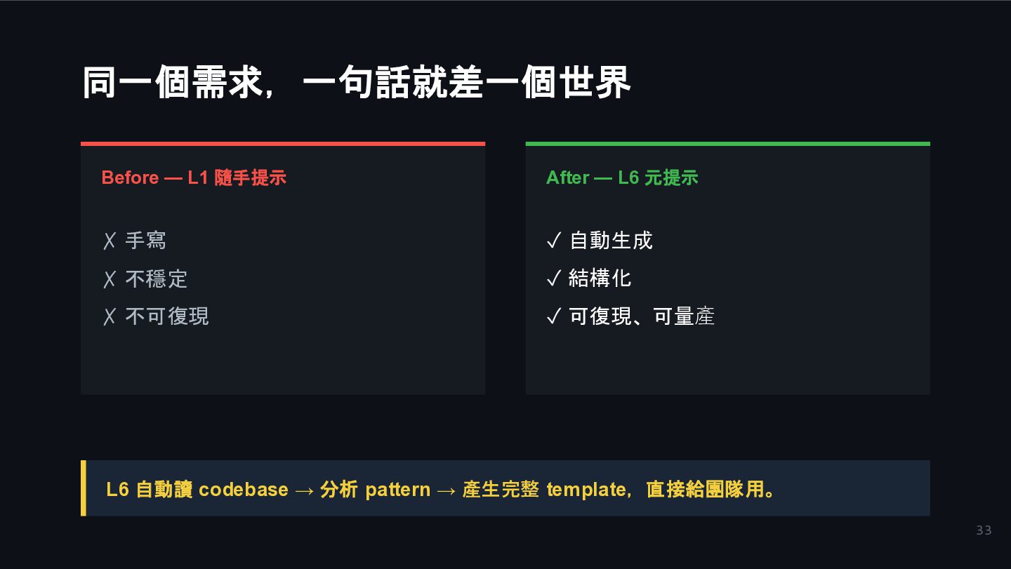 ✗ 不可復現 After — L6 元提示 ✓ 自動生成 ✓ 結構化 ✓ 可復現、可量產 L6 自動讀 codebase → 分析 pattern → 產生完整 template,直接給團隊用。