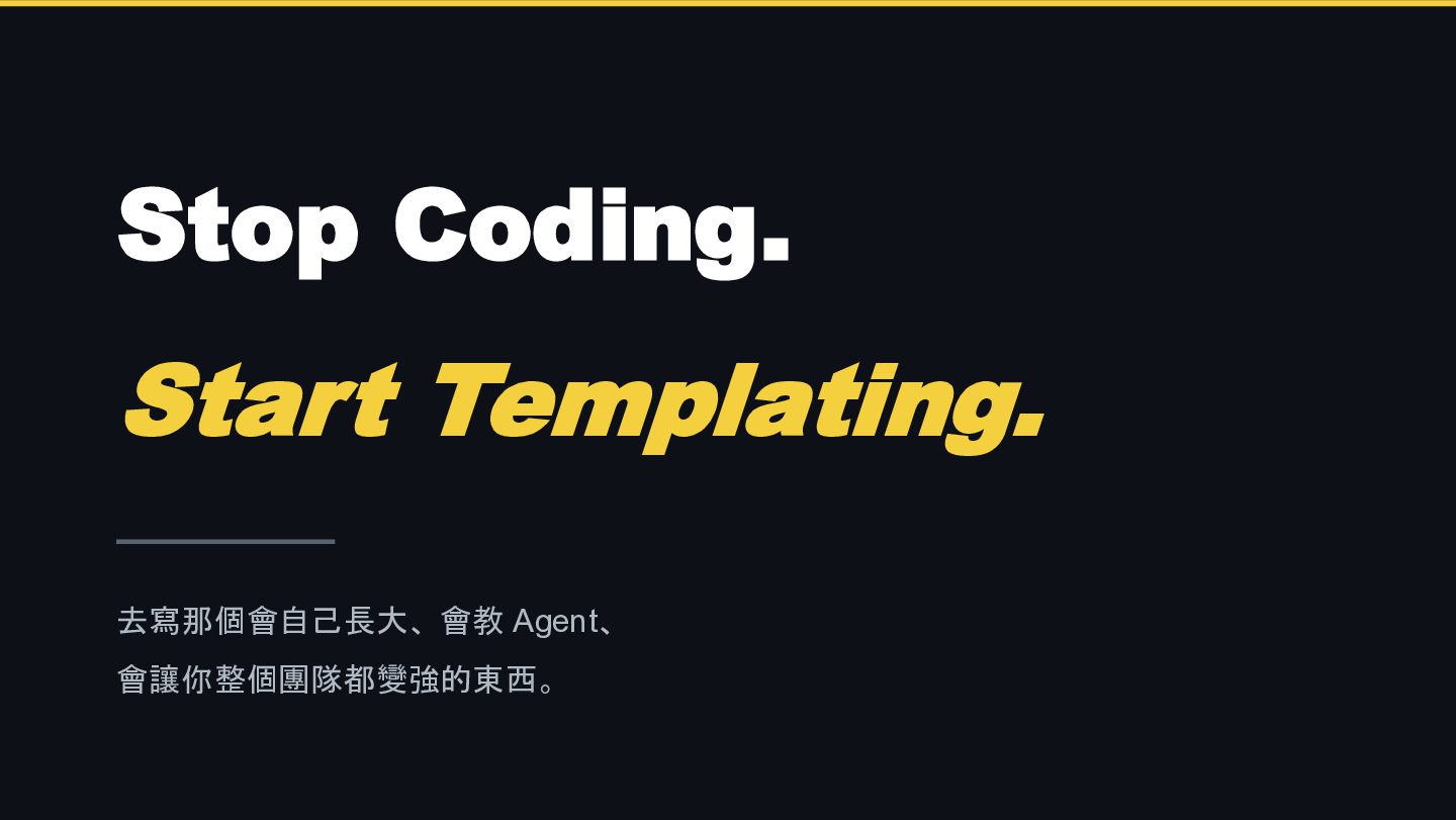 去寫那個會自己長大、會教 Agent、會讓你整個團隊都變強的 Prompt template。你才能夠把自己的槓桿擴散到團隊中