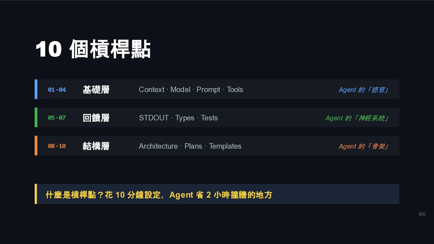 · Tools Agent 的「感官」 05-07 回饋層 STDOUT · Types · Tests Agent 的「神經系統」 08-10 結構層 Architecture · Plans · Templates Agent 的「骨架」 什麼是槓桿點?花 10 分鐘設定,Agent 省 2 小時撞牆的地方