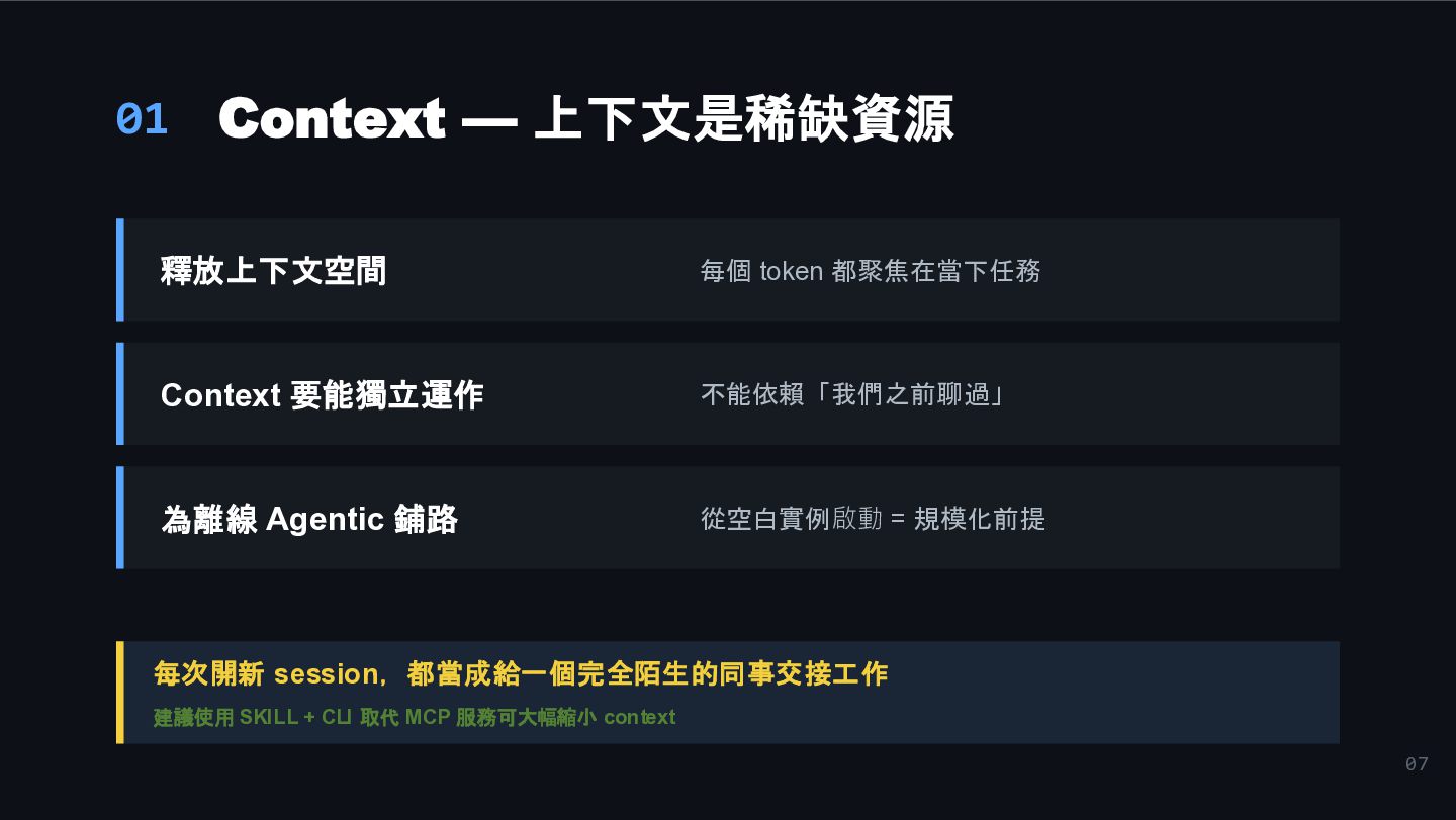 要能獨立運作 不能依賴「我們之前聊過」 為離線 Agentic 鋪路 從空白實例啟動 = 規模化前提 每次開新 session,都當成給一個完全陌生的同事交接工作 建議使用 SKILL + CLI 取代 MCP 服務可大幅縮小 context