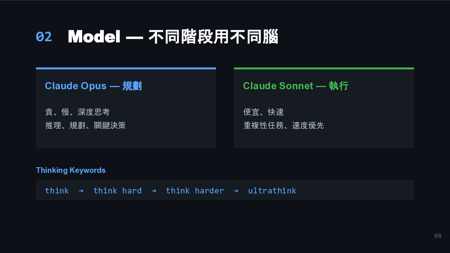 6. 08 02 Model — 不同階段用不同腦 Claude Opus — 規劃 貴、慢、深度思考