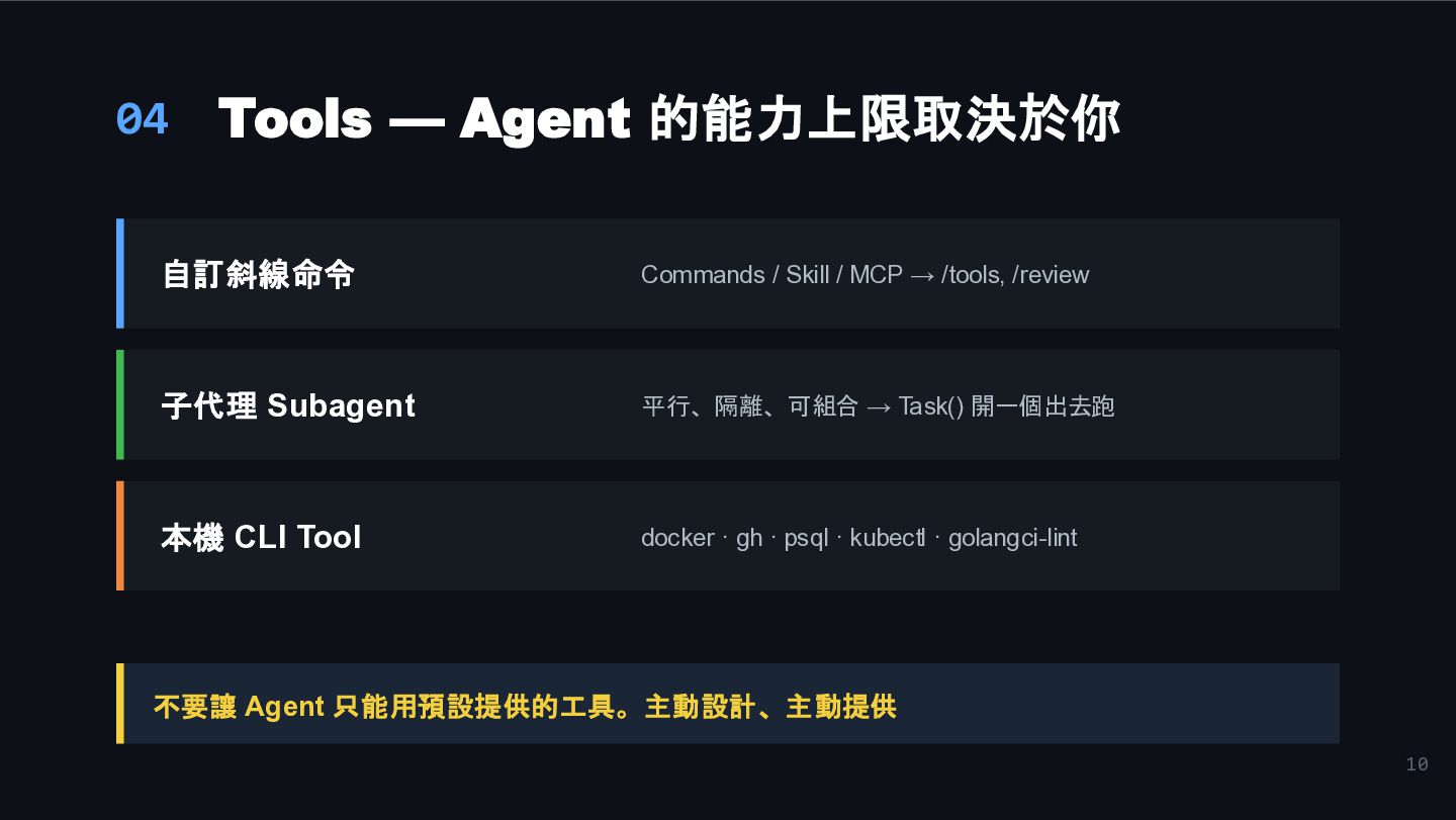 / MCP → /tools, /review 子代理 Subagent 平行、隔離、可組合 → Task() 開一個出去跑 本機 CLI Tool docker · gh · psql · kubectl · golangci-lint 不要讓 Agent 只能用預設提供的工具。主動設計、主動提供