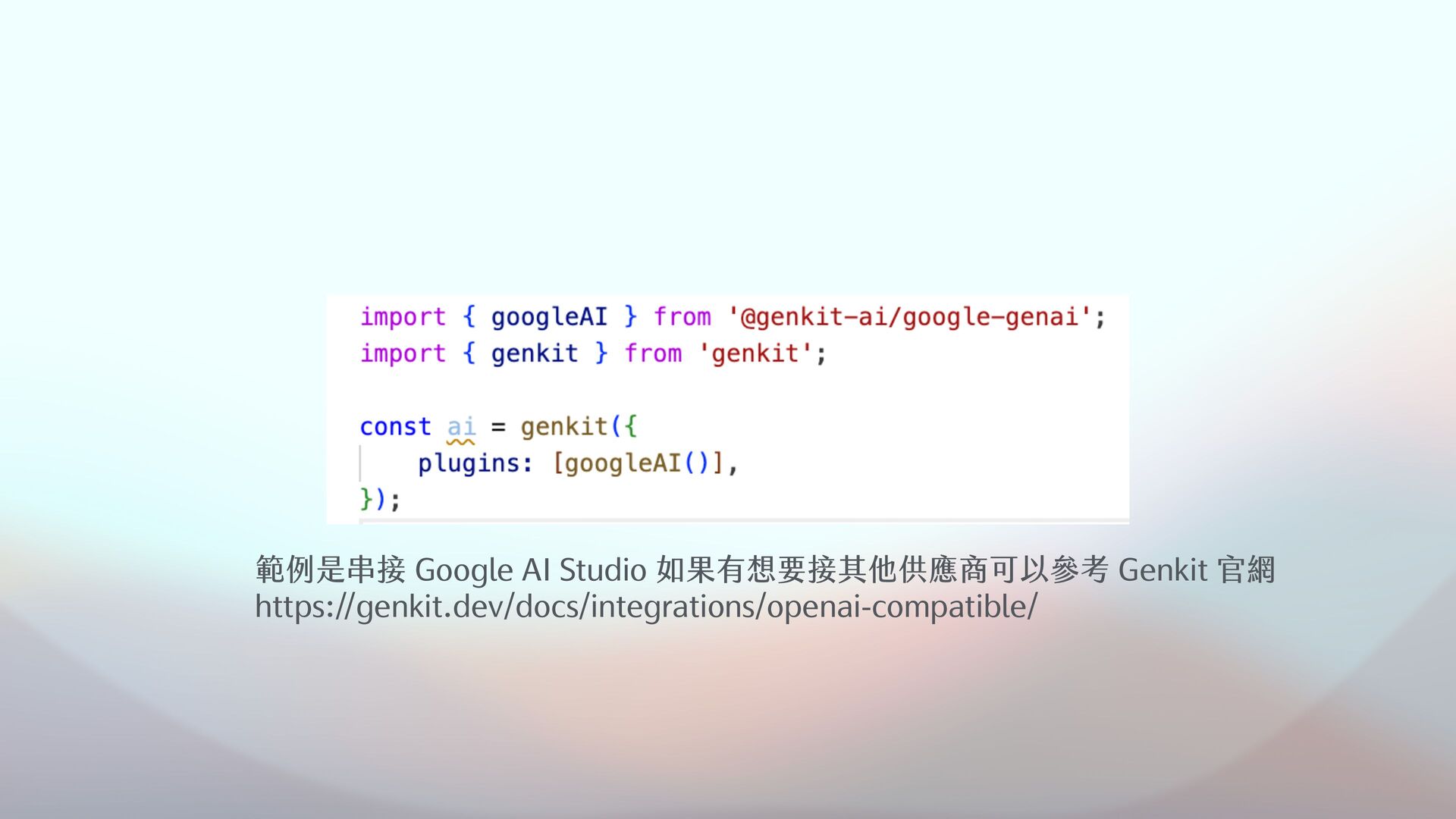 範例是串接 Google AI Studio 如果有想要接其他供應商可以參考 Genkit 官網 https://genkit.dev/docs/integrations/openai-compatible/