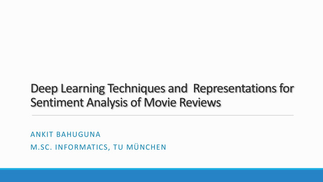 Analysis. Foundations and trends in Information Retrieval 2(1-2), pp 1-135, 2008 Yongzheng Zhang, Dan Shen and Catherine Baudin Sentiment Analysis in Practice, Tutorial delivered at ICDM 2011 Tomas Mikolov, Kai Chen, Greg Corrado, and Jeffrey Dean. Efficient Estimation of Word Representations in Vector Space. In Proceedings of Workshop at ICLR, 2013. Tomas Mikolov, Ilya Sutskever, Kai Chen, Greg Corrado, and Jeffrey Dean. Distributed Representations of Words and Phrases and their Compositionality. In Proceedings of NIPS, 2013. Richard Socher, Alex Perelygin, Jean Wu, Jason Chuang, Christopher Manning, Andrew Ng and Christopher Potts Recursive Deep Models for Semantic Compositionality Over a Sentiment Treebank, Conference on Empirical Methods in Natural Language Processing (EMNLP 2013) Rami Al-Rfou, Bryan Perozzi, and Steven Skiena Polyglot: Distributed Word Representations for Multilingual NLP Seventeenth Conference on Computational Natural Language Learning (CoNLL 2013) Jeffrey Pennington , Richard Socher , Christopher D. Manning Glove: global vectors for word representation Empirical Methods in Natural Language Processing (EMNLP), 2014 John Blitzer, Mark Dredze, Fernando Pereira. Biographies, Bollywood, Boom-boxes and Blenders: Domain Adaptation for Sentiment Classification. Association of Computational Linguistics (ACL), 2007. Minmin Chen, Zhixiang (Eddie) Xu, Kilian Q. Weinberger, Fei Sha. Marginalized Stacked Denoising Autoencoders for Domain Adaptation. Proceedings of 29th International Conference on Machine Learning (ICML), Edingburgh Scotland, Omnipress, pages 767-774, 2012