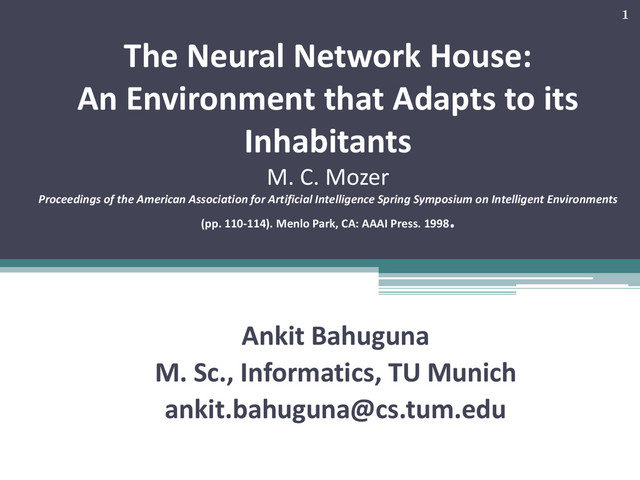 Inhabitants M. C. Mozer Proceedings of the American Association for Artificial Intelligence Spring Symposium on Intelligent Environments (pp. 110-114). Menlo Park, CA: AAAI Press. 1998 . Ankit Bahuguna M. Sc., Informatics, TU Munich [email protected] 1