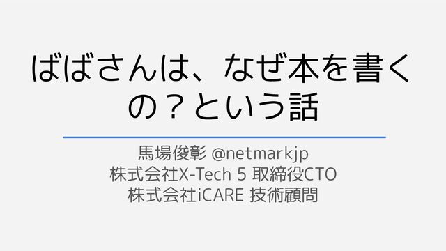 ばばさんは、なぜ本を書く の?という話 馬場俊彰 @netmarkjp 株式会社X-Tech 5 取締役CTO 株式会社iCARE 技術顧問