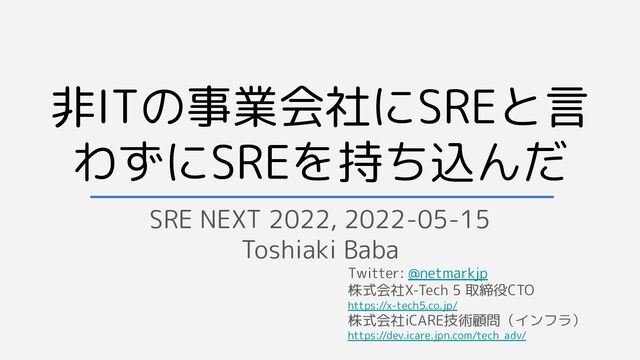 非ITの事業会社にSREと言 わずにSREを持ち込んだ SRE NEXT 2022, 2022-05-15 Toshiaki Baba Twitter: @netmarkjp