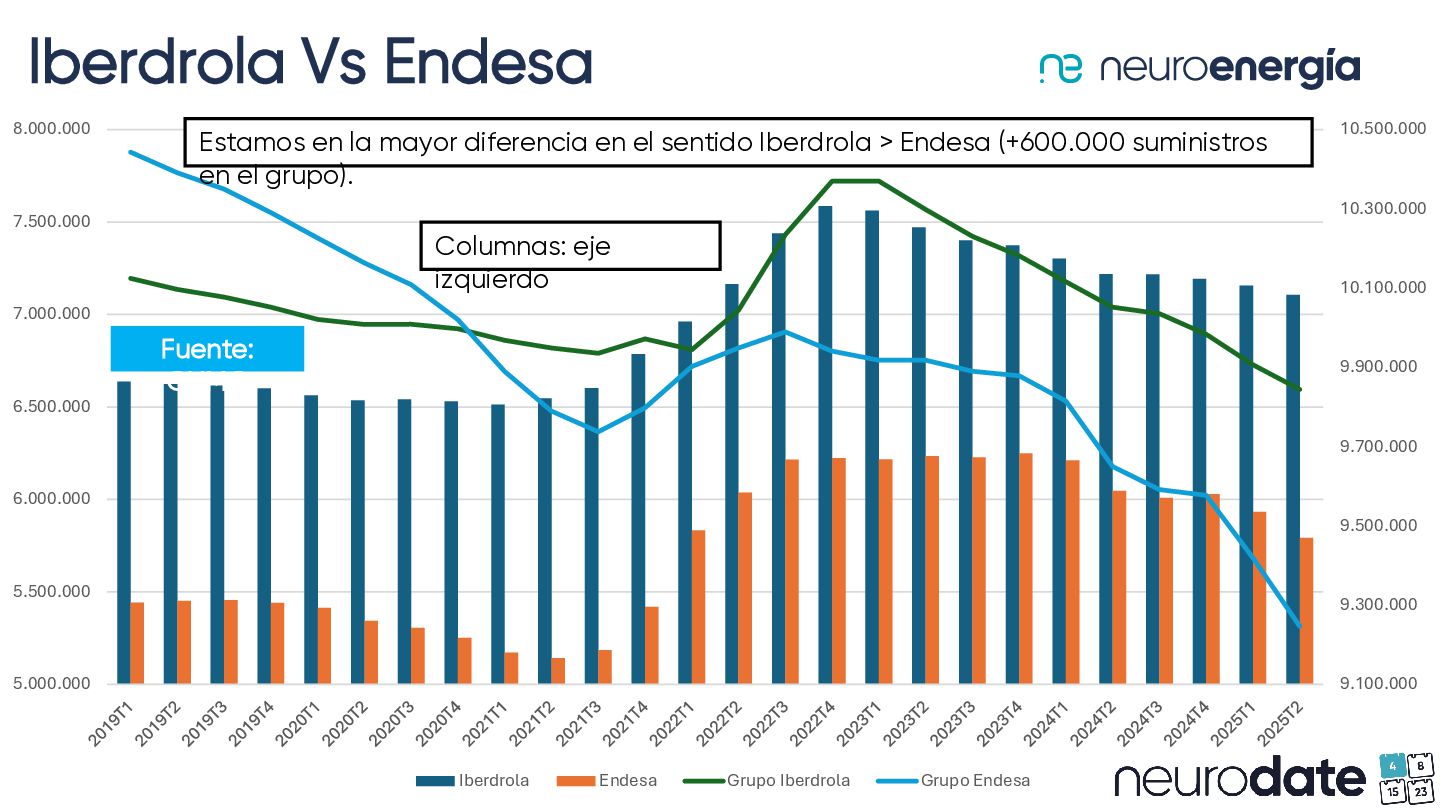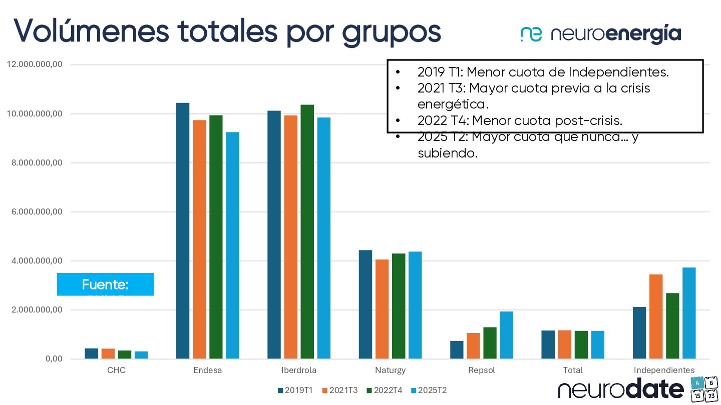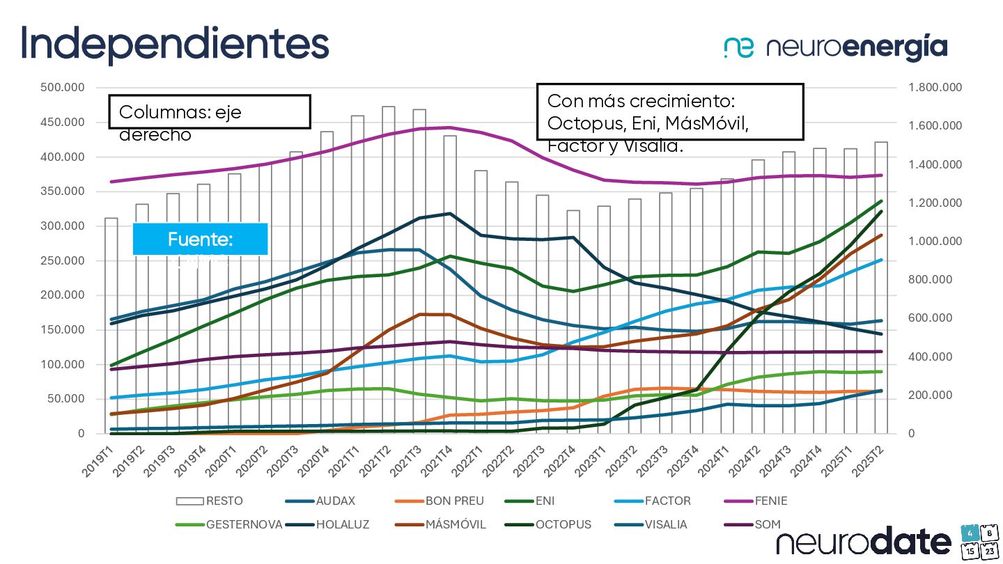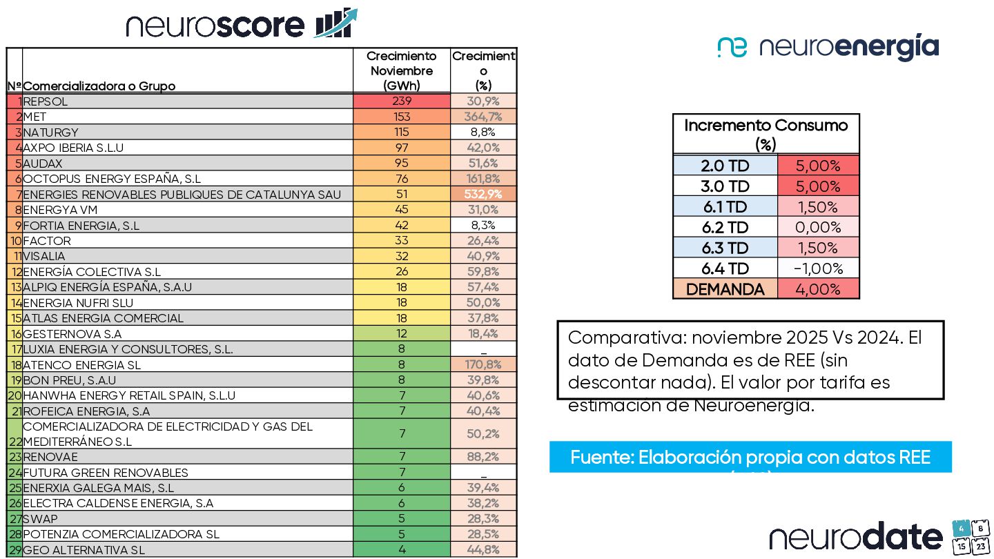 239 30,9% 2MET 153 364,7% 3NATURGY 115 8,8% 4AXPO IBERIA S.L.U 97 42,0% 5AUDAX 95 51,6% 6OCTOPUS ENERGY ESPAÑA, S.L 76 161,8% 7ENERGIES RENOVABLES PUBLIQUES DE CATALUNYA SAU 51 532,9% 8ENERGYA VM 45 31,0% 9FORTIA ENERGIA, S.L 42 8,3% 10FACTOR 33 26,4% 11VISALIA 32 40,9% 12ENERGÍA COLECTIVA S.L 26 59,8% 13ALPIQ ENERGÍA ESPAÑA, S.A.U 18 57,4% 14ENERGIA NUFRI SLU 18 50,0% 15ATLAS ENERGIA COMERCIAL 18 37,8% 16GESTERNOVA S.A 12 18,4% 17LUXIA ENERGIA Y CONSULTORES, S.L. 8 _ 18ATENCO ENERGIA SL 8 170,8% 19BON PREU, S.A.U 8 39,8% 20HANWHA ENERGY RETAIL SPAIN, S.L.U 7 40,6% 21ROFEICA ENERGIA, S.A 7 40,4% 22 COMERCIALIZADORA DE ELECTRICIDAD Y GAS DEL MEDITERRÁNEO S.L 7 50,2% 23RENOVAE 7 88,2% 24FUTURA GREEN RENOVABLES 7 _ 25ENERXIA GALEGA MAIS, S.L 6 39,4% 26ELECTRA CALDENSE ENERGIA, S.A 6 38,2% 27SWAP 5 28,3% 28POTENZIA COMERCIALIZADORA SL 5 28,5% 29GEO ALTERNATIVA SL 4 44,8% Incremento Consumo (%) 2.0 TD 5,00% 3.0 TD 5,00% 6.1 TD 1,50% 6.2 TD 0,00% 6.3 TD 1,50% 6.4 TD -1,00% DEMANDA 4,00% Comparativa: noviembre 2025 Vs 2024. El dato de Demanda es de REE (sin descontar nada). El valor por tarifa es estimación de Neuroenergía. Fuente: Elaboración propia con datos REE (p48)