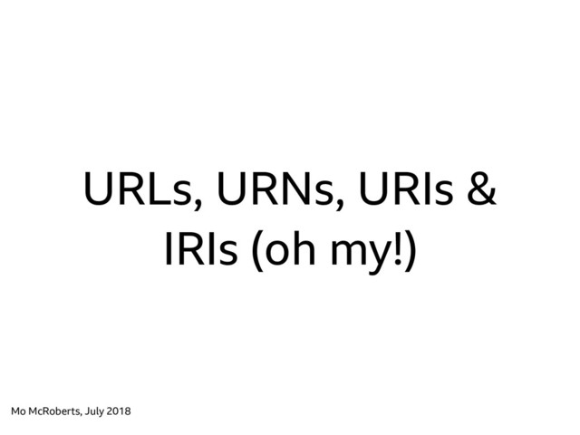 a joint W3C/IETF working group of the “Universal Resource Indicator”, a single syntax encompassing both URLs and URIs; • In 2005, [RFC 3986] reinforced this, deprecating the terms “URL” and “URN” altogether; • [RFC 3987], also in 2005, introduced a superset of URIs, IRIs (“Internationalized Resource Identifier”), which can contain non-ASCII characters.