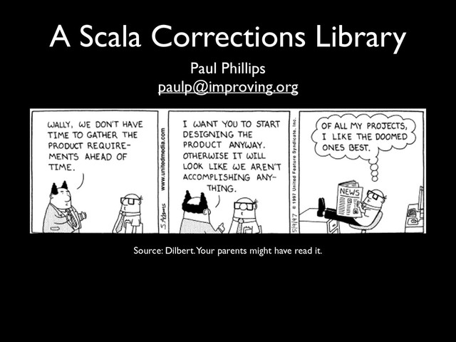 (in scala: any covariant collection, e.g. List, Vector) type Min[+X] // least type constructor which can be reconstituted to CC[X] (scala: GenTraversableOnce) type Opt[+X] // the container type for optional results (in scala: Option) type CCPair[+X] // some representation of a divided CC[A] (at simplest, (CC[A], CC[A])) type ~>[-V1, +V2] // some means of composing operations (at simplest, Function1) ! type Iso[A] = CC[A] ~> CC[A] // e.g. filter, take, drop, reverse, etc. type Map[-A, +B] = CC[A] ~> CC[B] // e.g. map, collect type FlatMap[-A, +B] = CC[A] ~> Min[B] // e.g. flatMap type Grouped[A, DD[X]] = CC[A] ~> CC[DD[A]] // e.g. sliding type Fold[-A, +R] = CC[A] ~> R // e.g. fold, but also subsumes all operations on CC[A] type Flatten[A] = CC[Min[A]] ~> CC[A] // e.g. flatten type Build[A] = Min[A] ~> CC[A] // for use in e.g. sliding, flatMap type Pure[A] = A ~> CC[A] // we may not need ! trait Relations[A] { type MapTo[+B] = Map[A, B] // an alias incorporating the known A type FoldTo[+R] = Fold[A, R] // another one type This = CC[A] // the CC[A] under consideration type Twosome = CCPair[A] // a (CC[A], CC[A]) representation type Self = Iso[A] // a.k.a. CC[A] => CC[A], e.g. tail, filter, reverse type Select = FoldTo[A] // a.k.a. CC[A] => A, e.g. head, reduce, max type Find = FoldTo[Opt[A]] // a.k.a. CC[A] => Opt[A], e.g. find type Split = FoldTo[Twosome] // a.k.a. CC[A] => (CC[A], CC[A]), e.g. partition, span } } Conceptual Integrity