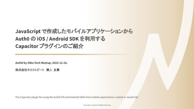 iOS / Android SDK を利用する Capacitor プラグインのご紹介 Auth0 by Okta Tech Meetup, 2023-11-16. 株式会社ネクストビート 溝上 友貴 The Capacitor plugin for using the Auth0 iOS and Android SDKs from mobile applications created in JavaScript