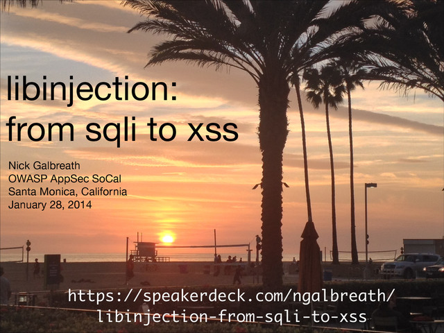 SoCal. See you next year! —nickg If you have any questions on libinjection, please see https://libinjection.client9.com/ or email me at [email protected]