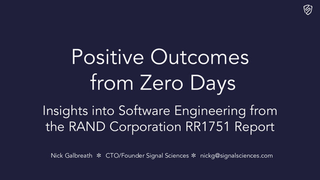 In March 2017 the RAND Corporation released a report “Zero Days, Thousands of Nights: The Life and Times of Zero-Day Vulnerabilities and Their Exploits”. The goal was to assess the public policy of governments stockpiling or releasing so-called 0-day exploits. While that remains an open question, the report and underlying data set of real-world exploits provides valuable insights into software engineering for security and resilience. This talk will provide an overview of the report and what it means for builders and defenders.