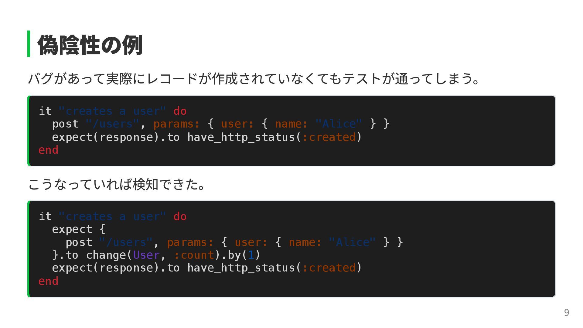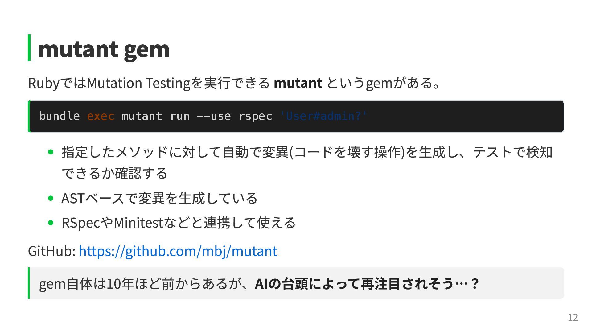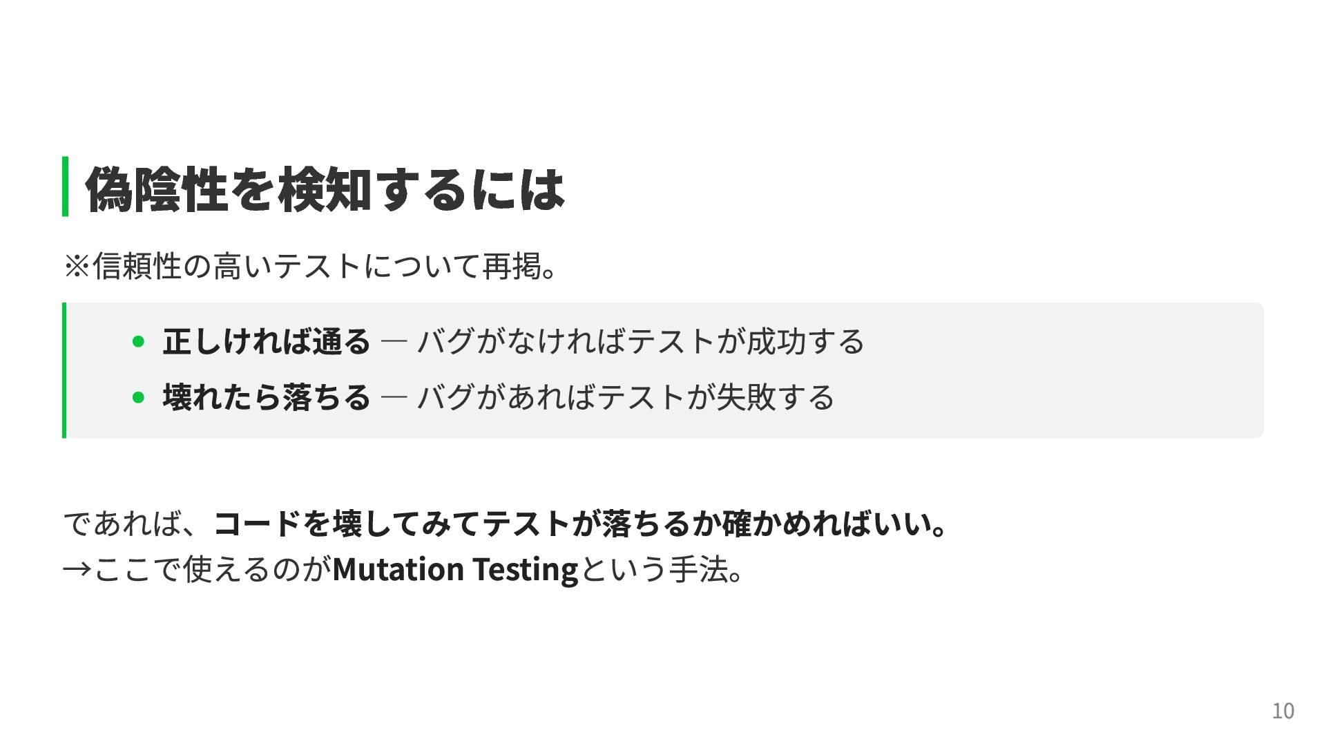 # 元のコード # Mutation(変異) if user.admin? if !user.admin? grant_access grant_access end end テストが落ちなければ、そのテストは偽陰性を含んでいる可能性が高い。 テストを追加して検出力を上げ、正しく落ちるように改善していく。 →こうして信頼性を育てることができる。 11