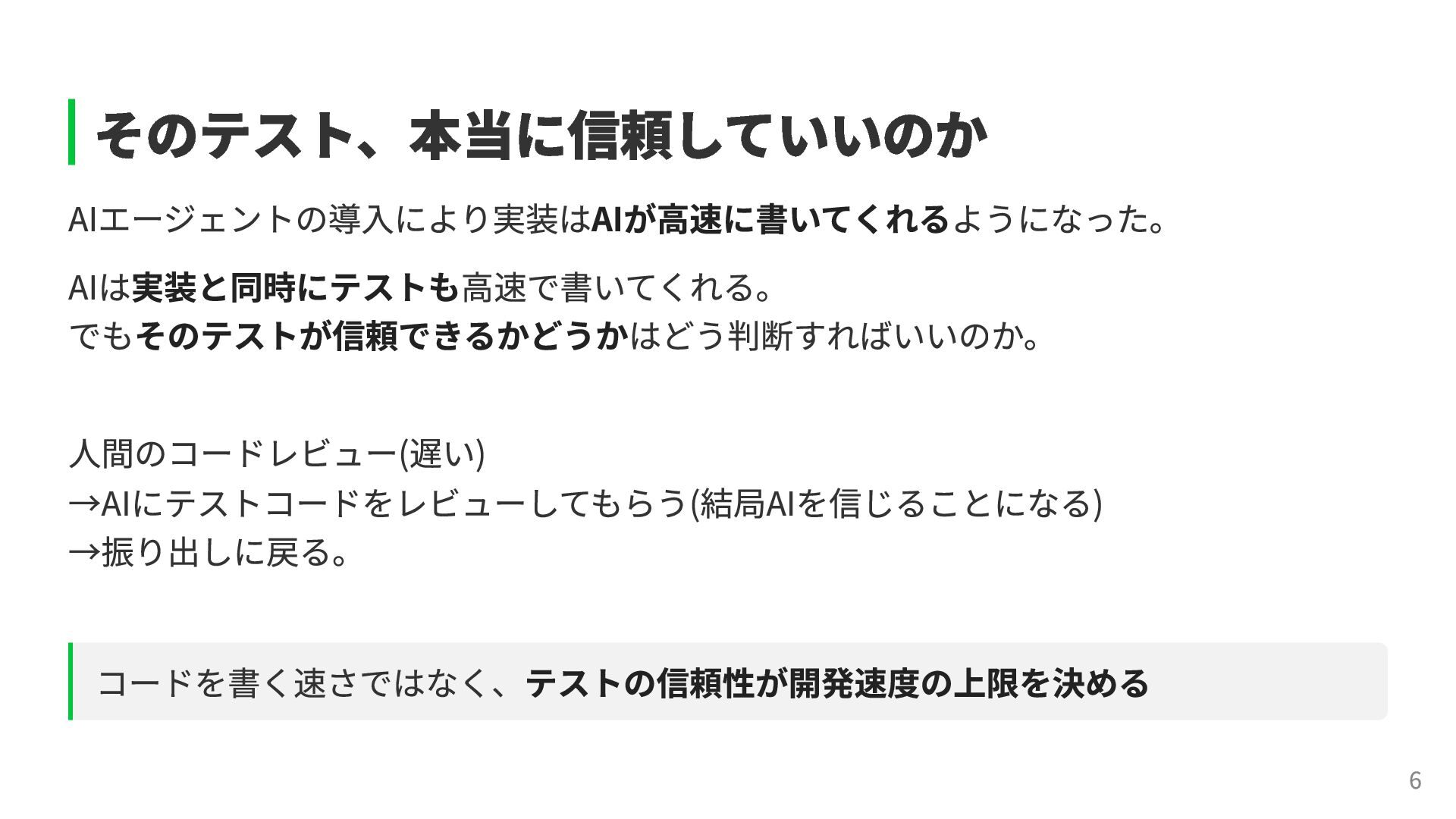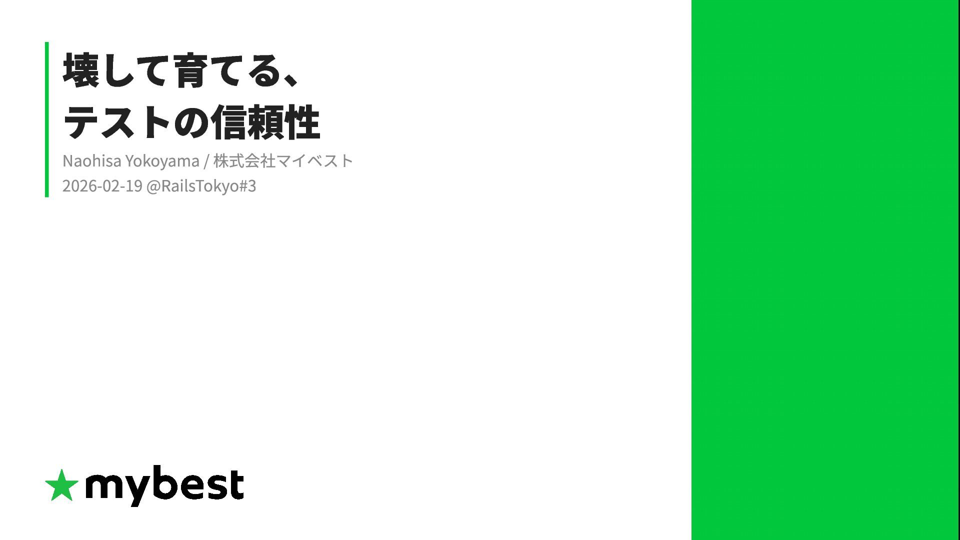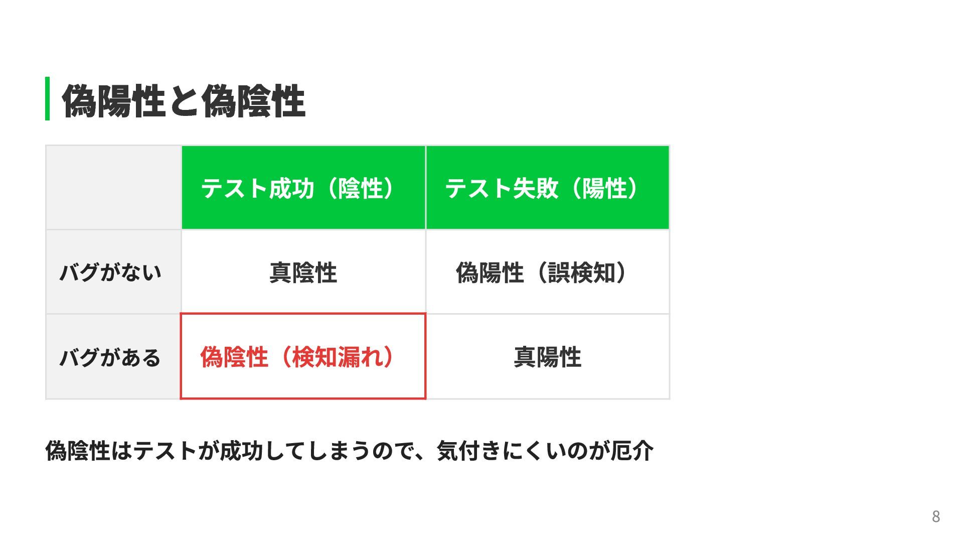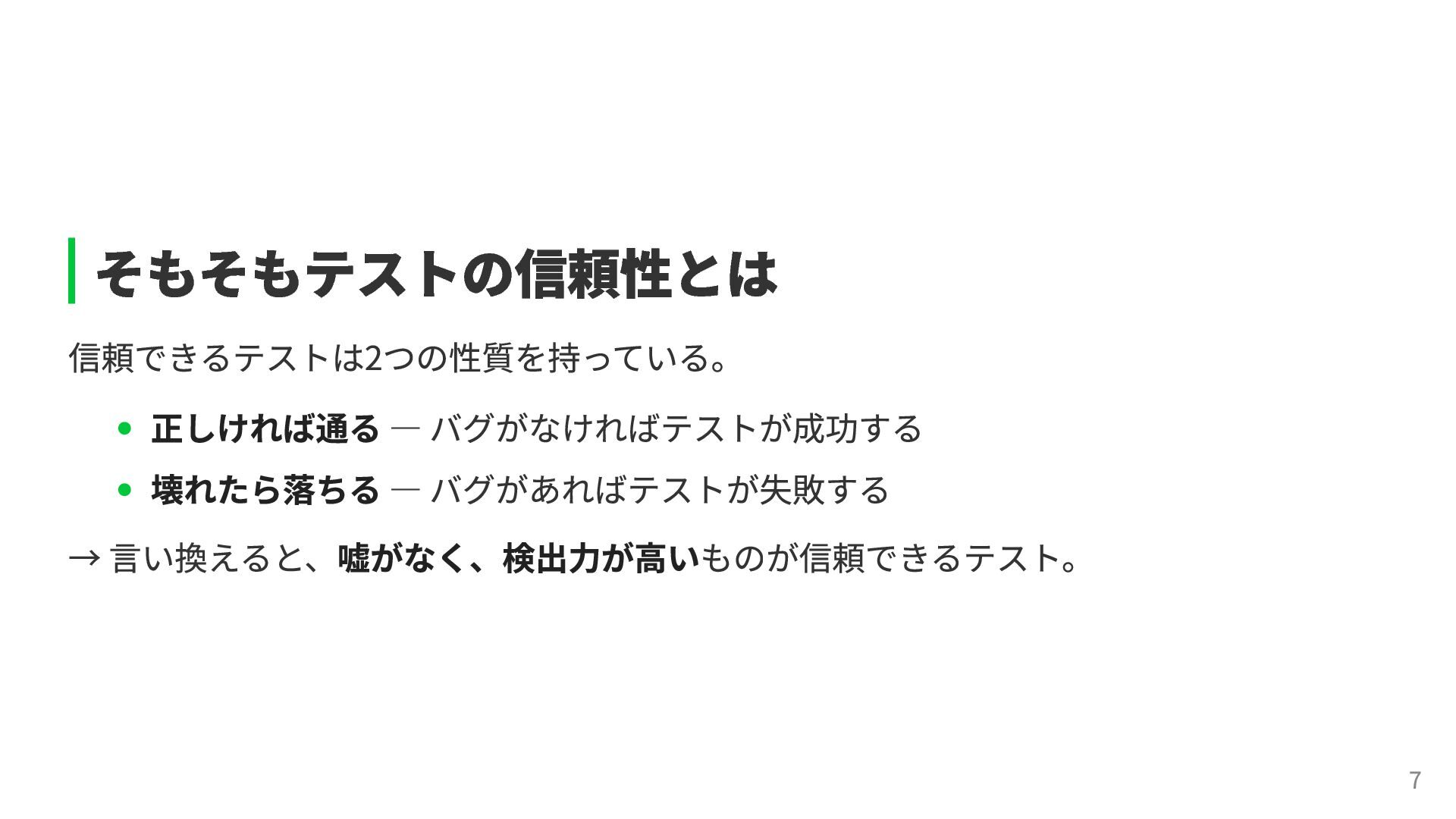 # 元のコード # Mutation(変異) if user.admin? if !user.admin? grant_access grant_access end end テストが落ちなければ、そのテストは偽陰性を含んでいる可能性が高い。 テストを追加して検出力を上げ、正しく落ちるように改善していく。 →こうして信頼性を育てることができる。 11