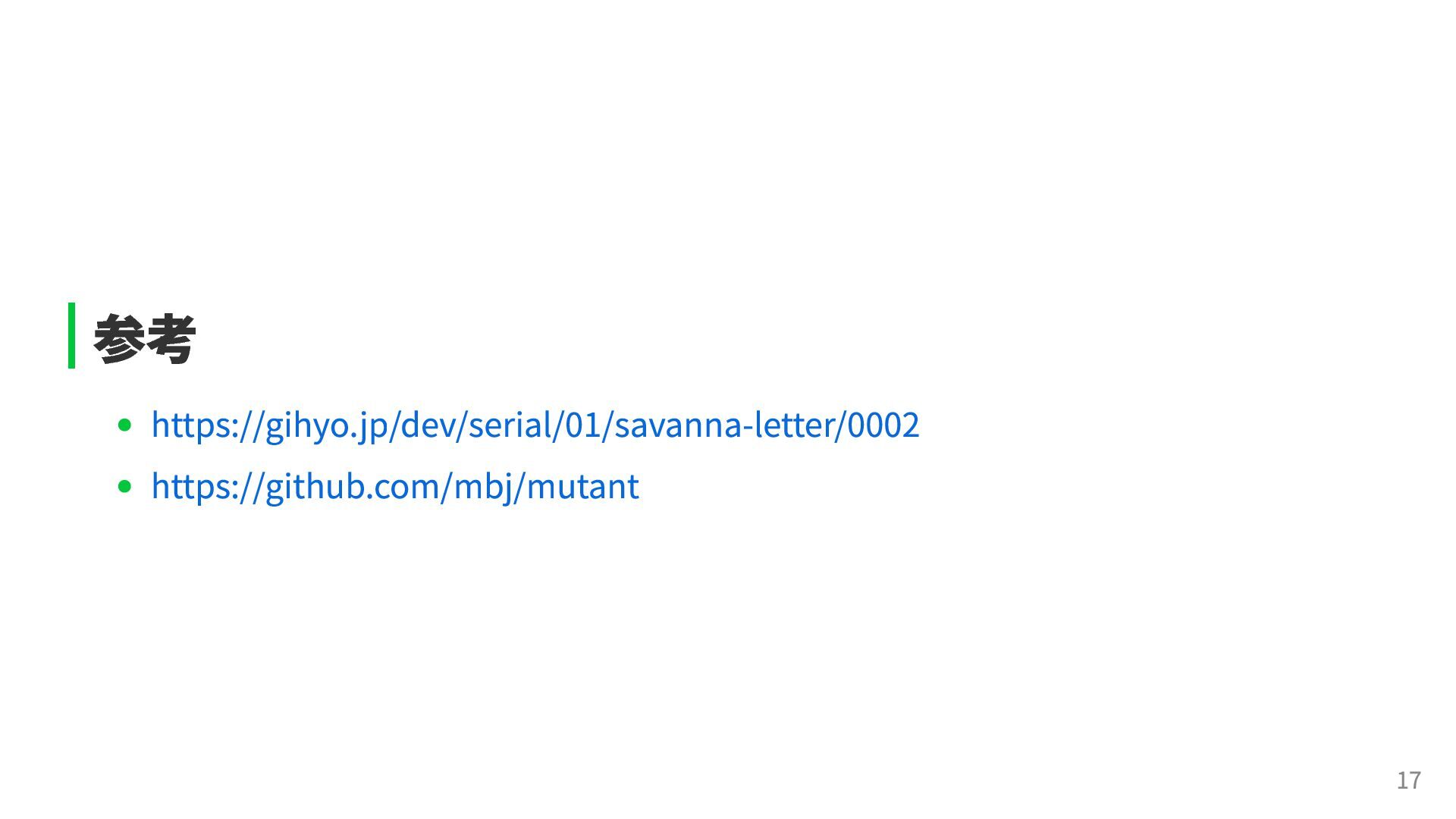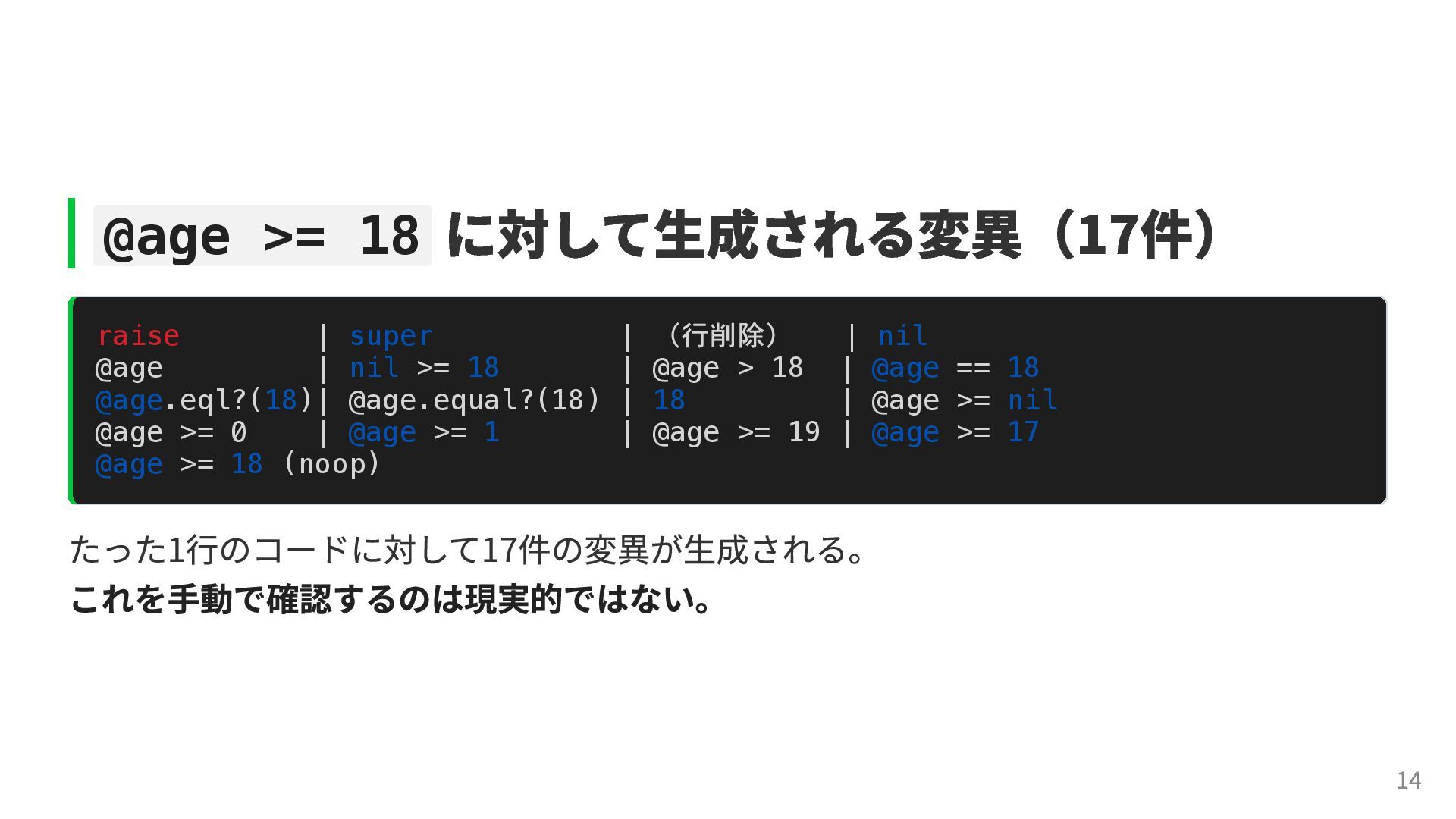 true for age 19' do def adult? expect(Person.new(age: 19).adult?).to be(true) @age >= 18 end end it 'returns false for age 17' do end expect(Person.new(age: 17).adult?).to be(false) end mutantを実行すると、17件の変異のうち2件が生き残ってしまった Mutations: 17 Results: 17 Kills: 15 Alive: 2 def adult? - @age >= 18 + @age > 18 end → age == 18 の境界値テストが不足していたことが分かった。 13
