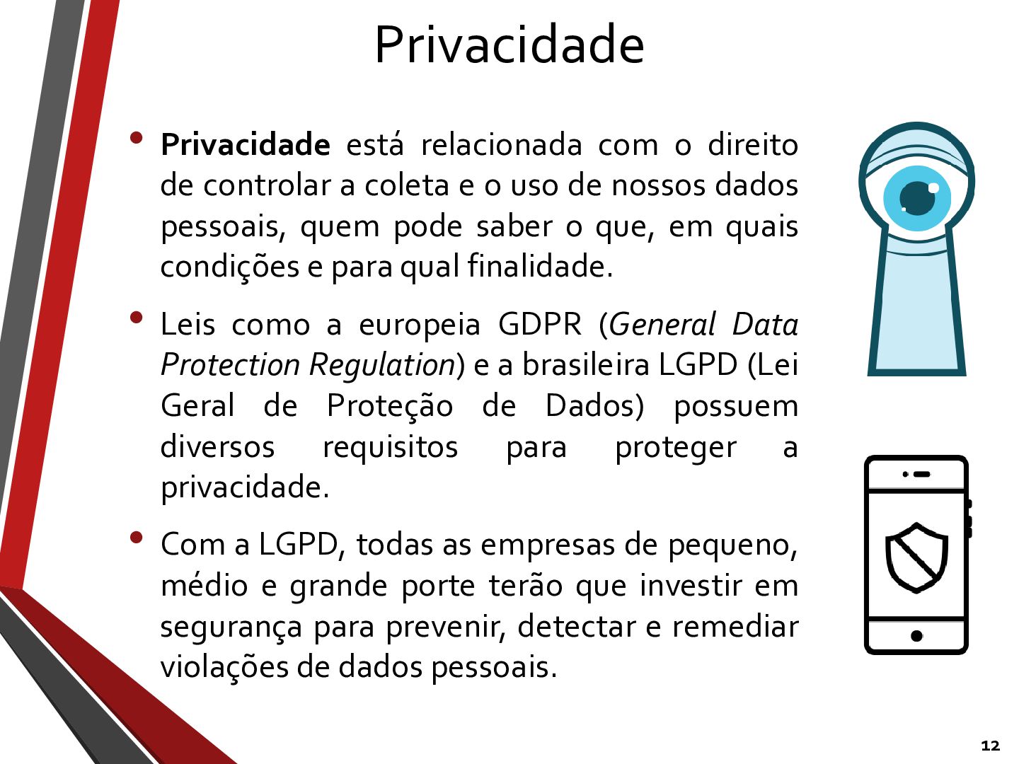 controlar a coleta e o uso de nossos dados pessoais, quem pode saber o que, em quais condições e para qual finalidade. • Leis como a europeia GDPR (General Data Protection Regulation) e a brasileira LGPD (Lei Geral de Proteção de Dados) possuem diversos requisitos para proteger a privacidade. • Com a LGPD, todas as empresas de pequeno, médio e grande porte terão que investir em segurança para prevenir, detectar e remediar violações de dados pessoais.