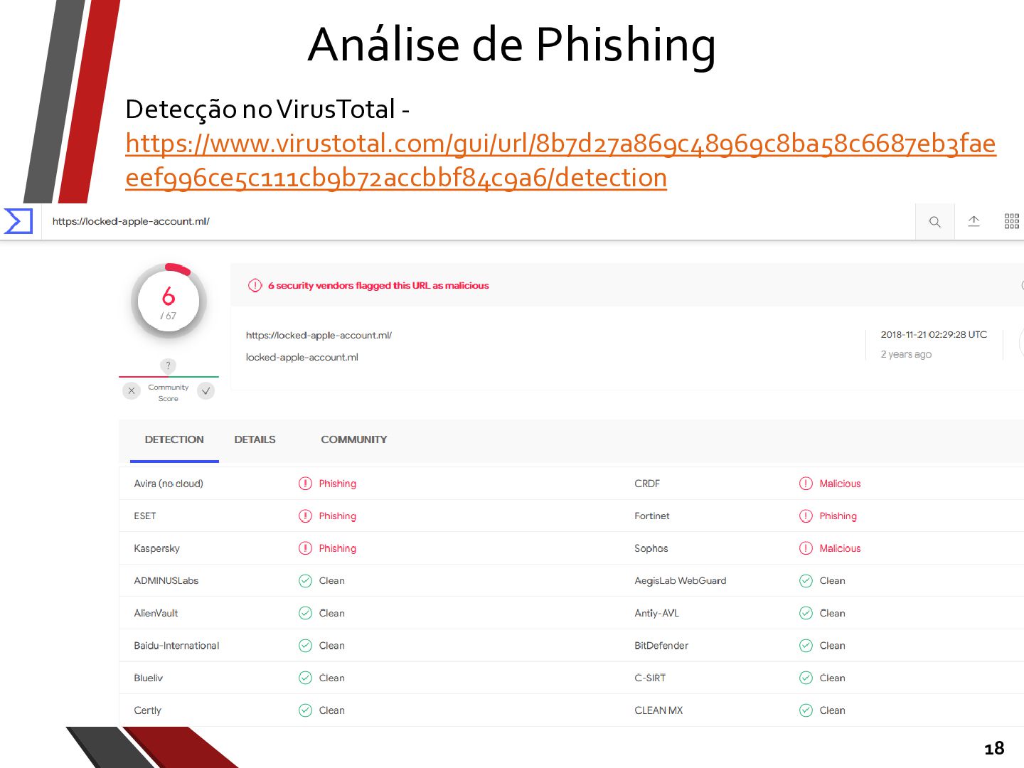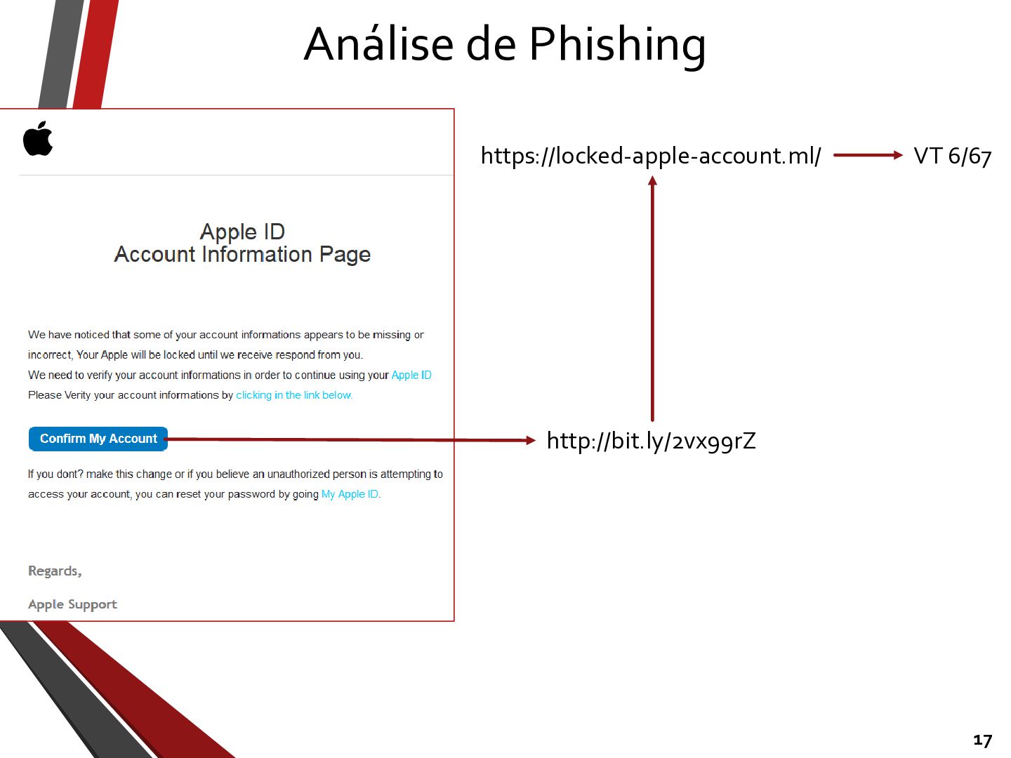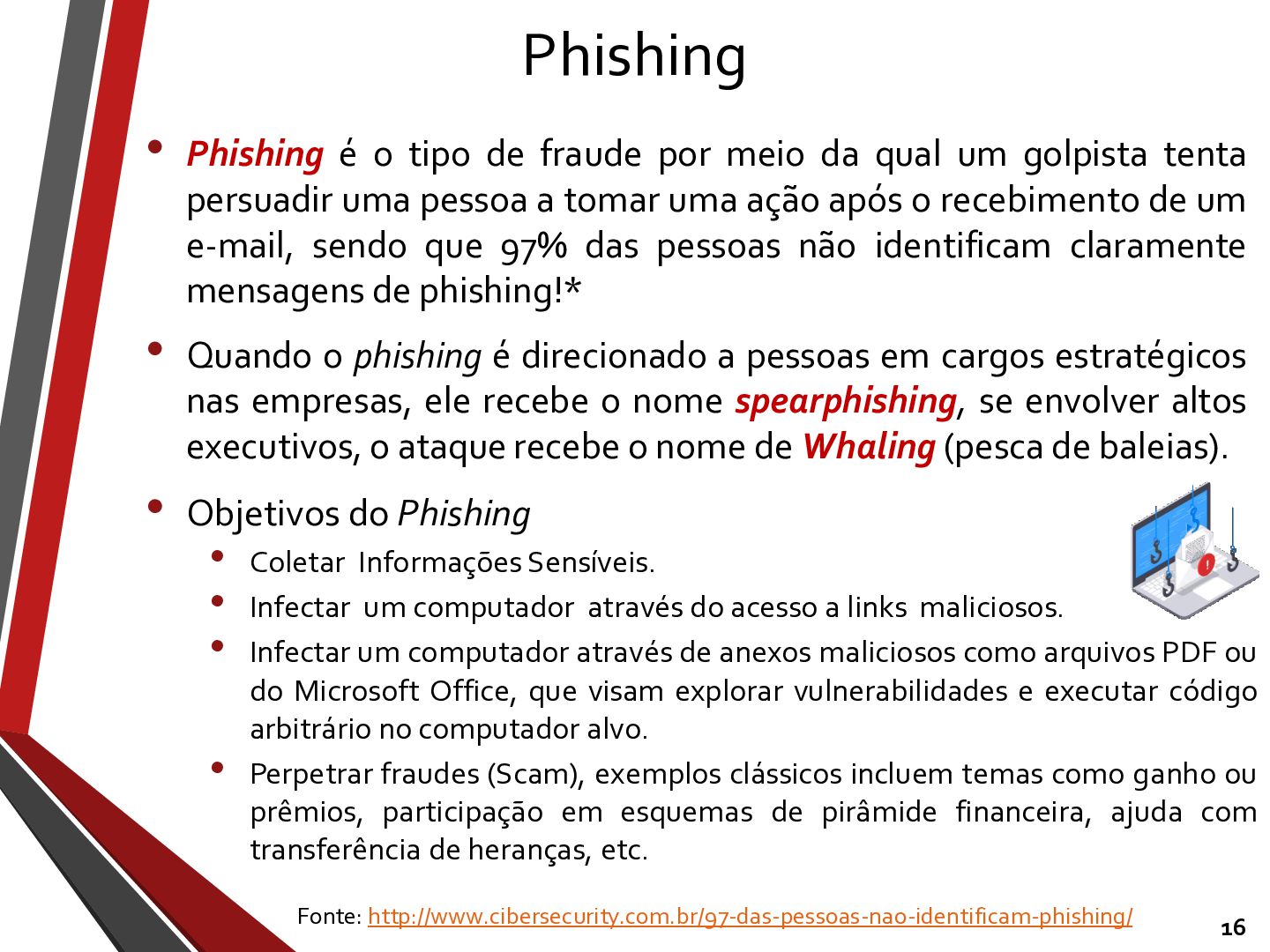 um computador através do acesso a links maliciosos. • Infectar um computador através de anexos maliciosos como arquivos PDF ou do Microsoft Office, que visam explorar vulnerabilidades e executar código arbitrário no computador alvo. • Perpetrar fraudes (Scam), exemplos clássicos incluem temas como ganho ou prêmios, participação em esquemas de pirâmide financeira, ajuda com transferência de heranças, etc. Phishing • Phishing é o tipo de fraude por meio da qual um golpista tenta persuadir uma pessoa a tomar uma ação após o recebimento de um e-mail, sendo que 97% das pessoas não identificam claramente mensagens de phishing!* • Quando o phishing é direcionado a pessoas em cargos estratégicos nas empresas, ele recebe o nome spearphishing, se envolver altos executivos, o ataque recebe o nome de Whaling (pesca de baleias). 16 Fonte: http://www.cibersecurity.com.br/97-das-pessoas-nao-identificam-phishing/