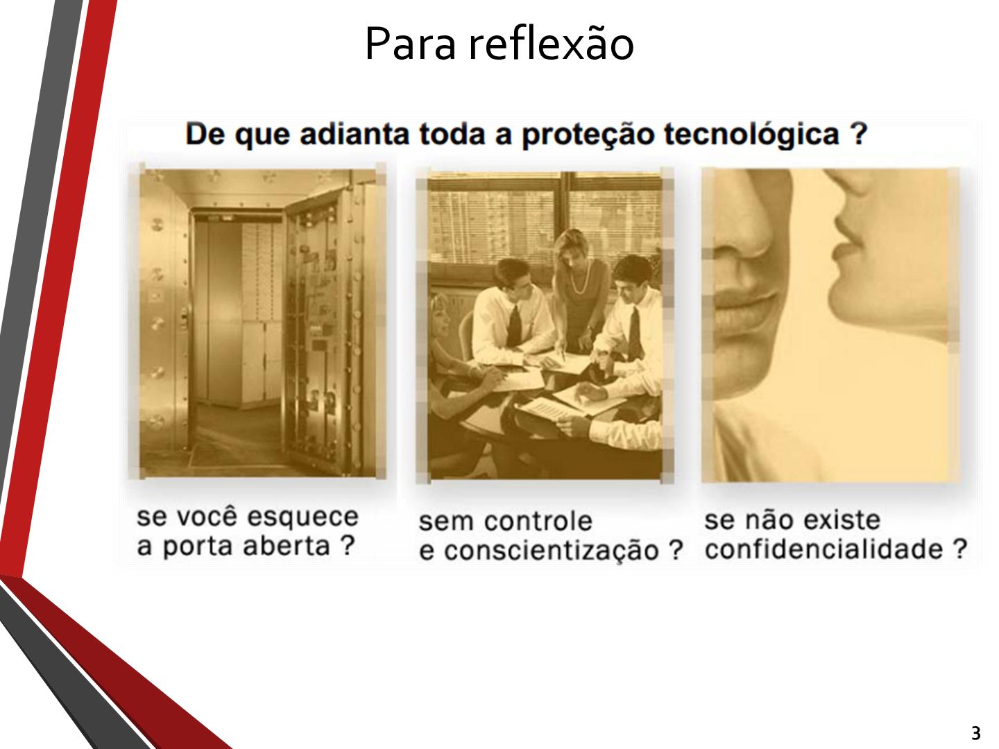 aos estímulos e situações de forma distinta, por isso o comportamento humano dificilmente pode ser previsto. • Uma organização não deve confiar cegamente que seus colaboradores terão um comportamento de acordo com suas expectativas para com a proteção de suas informações. • A assinatura da política de segurança e do acordo de confidencialidade não assegura que o comportamento das pessoas será conforme o esperado! 2