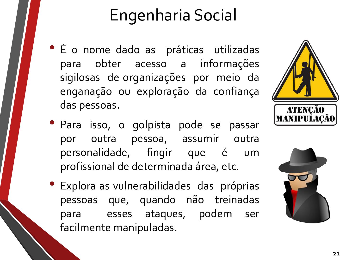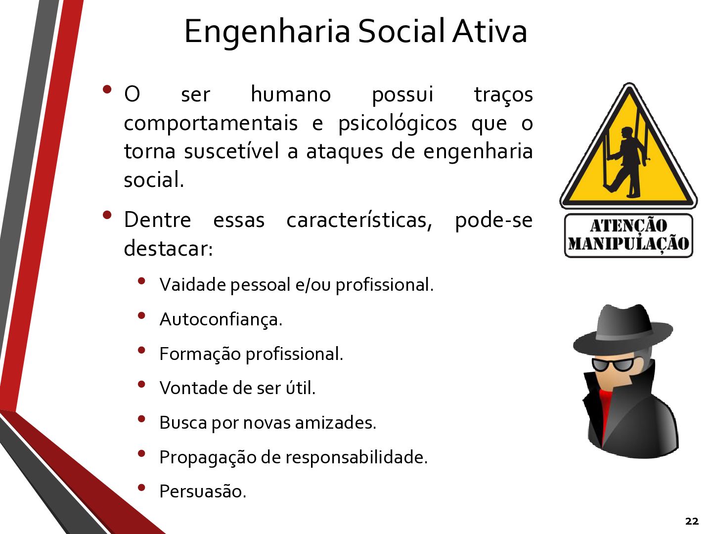 e psicológicos que o torna suscetível a ataques de engenharia social. • Dentre essas características, pode-se destacar: • Vaidade pessoal e/ou profissional. • Autoconfiança. • Formação profissional. • Vontade de ser útil. • Busca por novas amizades. • Propagação de responsabilidade. • Persuasão. 22