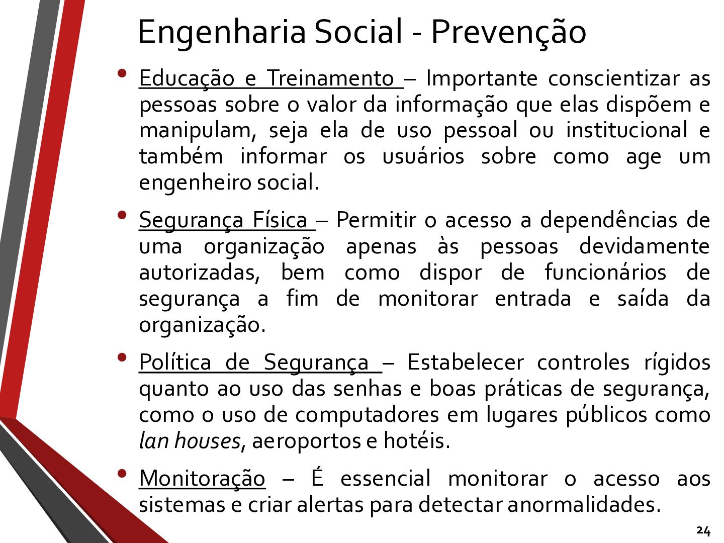 conscientizar as pessoas sobre o valor da informação que elas dispõem e manipulam, seja ela de uso pessoal ou institucional e também informar os usuários sobre como age um engenheiro social. • Segurança Física – Permitir o acesso a dependências de uma organização apenas às pessoas devidamente autorizadas, bem como dispor de funcionários de segurança a fim de monitorar entrada e saída da organização. • Política de Segurança – Estabelecer controles rígidos quanto ao uso das senhas e boas práticas de segurança, como o uso de computadores em lugares públicos como lan houses, aeroportos e hotéis. • Monitoração – É essencial monitorar o acesso aos sistemas e criar alertas para detectar anormalidades. 24