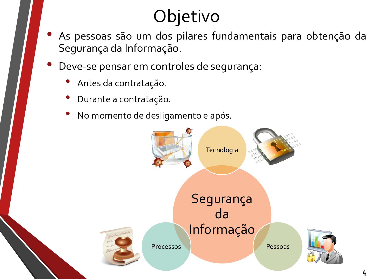 obtenção da Segurança da Informação. • Deve-se pensar em controles de segurança: • Antes da contratação. • Durante a contratação. • No momento de desligamento e após. 4 Segurança da Informação Tecnologia Pessoas Processos