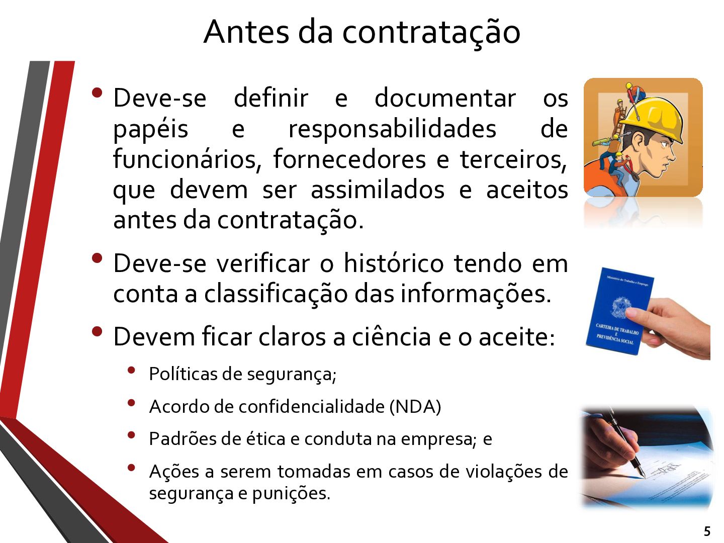 e responsabilidades de funcionários, fornecedores e terceiros, que devem ser assimilados e aceitos antes da contratação. • Deve-se verificar o histórico tendo em conta a classificação das informações. • Devem ficar claros a ciência e o aceite: • Políticas de segurança; • Acordo de confidencialidade (NDA) • Padrões de ética e conduta na empresa; e • Ações a serem tomadas em casos de violações de segurança e punições. 5