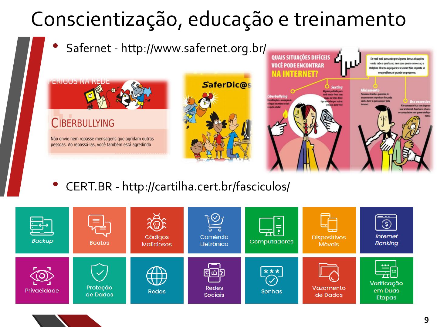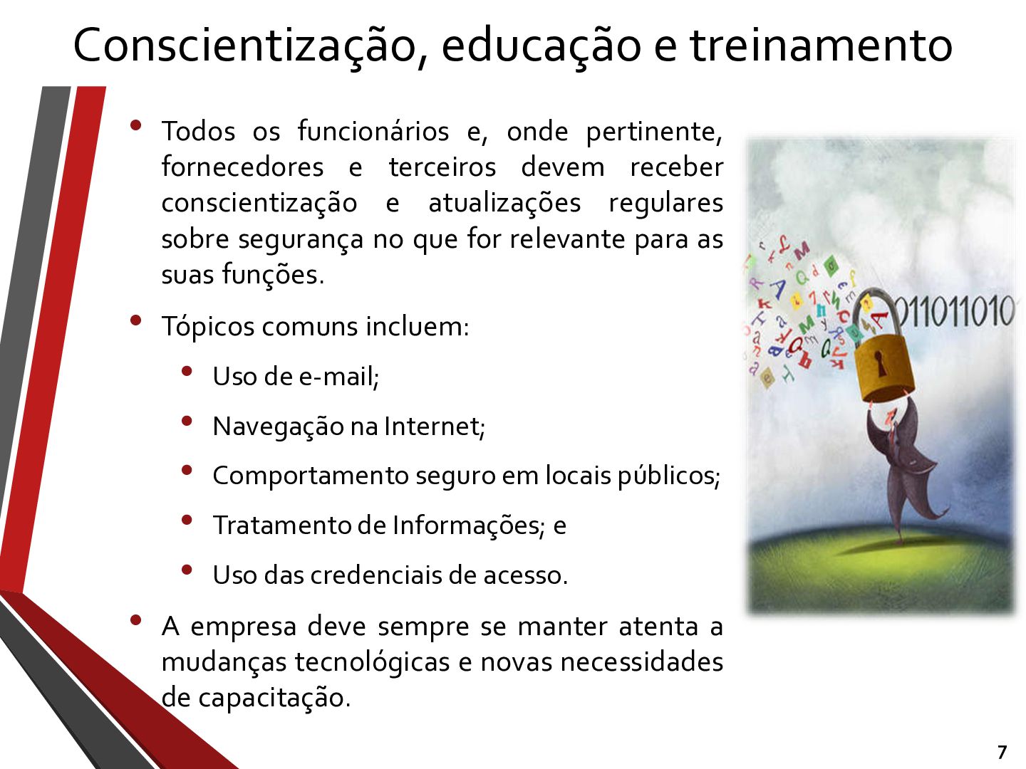 pertinente, fornecedores e terceiros devem receber conscientização e atualizações regulares sobre segurança no que for relevante para as suas funções. • Tópicos comuns incluem: • Uso de e-mail; • Navegação na Internet; • Comportamento seguro em locais públicos; • Tratamento de Informações; e • Uso das credenciais de acesso. • A empresa deve sempre se manter atenta a mudanças tecnológicas e novas necessidades de capacitação. 7