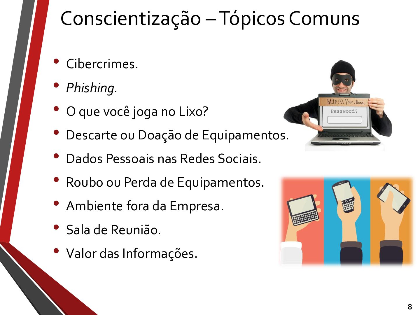você joga no Lixo? • Descarte ou Doação de Equipamentos. • Dados Pessoais nas Redes Sociais. • Roubo ou Perda de Equipamentos. • Ambiente fora da Empresa. • Sala de Reunião. • Valor das Informações. 8