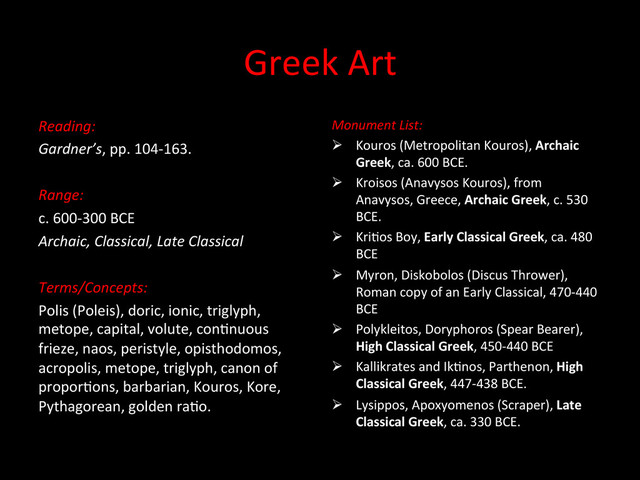 Range: c. 600-‐300 BCE Archaic, Classical, Late Classical Terms/Concepts: Polis (Poleis), doric, ionic, triglyph, metope, capital, volute, conEnuous frieze, naos, peristyle, opisthodomos, acropolis, metope, triglyph, canon of proporEons, barbarian, Kouros, Kore, Pythagorean, golden raEo. Monument List: Kouros (Metropolitan Kouros), Archaic Greek, ca. 600 BCE. Kroisos (Anavysos Kouros), from Anavysos, Greece, Archaic Greek, c. 530 BCE. KriEos Boy, Early Classical Greek, ca. 480 BCE Myron, Diskobolos (Discus Thrower), Roman copy of an Early Classical, 470-‐440 BCE Polykleitos, Doryphoros (Spear Bearer), High Classical Greek, 450-‐440 BCE Kallikrates and IkEnos, Parthenon, High Classical Greek, 447-‐438 BCE. Lysippos, Apoxyomenos (Scraper), Late Classical Greek, ca. 330 BCE.