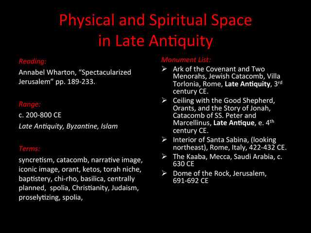 Reading: Annabel Wharton, “Spectacularized Jerusalem” pp. 189-‐233. Range: c. 200-‐800 CE Late An-quity, Byzan-ne, Islam Terms: syncre4sm, catacomb, narra4ve image, iconic image, orant, ketos, torah niche, bap4stery, chi-‐rho, basilica, centrally planned, spolia, Chris4anity, Judaism, prosely4zing, spolia, Monument List: Ark of the Covenant and Two Menorahs, Jewish Catacomb, Villa Torlonia, Rome, Late An(quity, 3rd century CE. Ceiling with the Good Shepherd, Orants, and the Story of Jonah, Catacomb of SS. Peter and Marcellinus, Late An(que, e. 4th century CE. Interior of Santa Sabina, (looking northeast), Rome, Italy, 422-‐432 CE. The Kaaba, Mecca, Saudi Arabia, c. 630 CE Dome of the Rock, Jerusalem, 691-‐692 CE