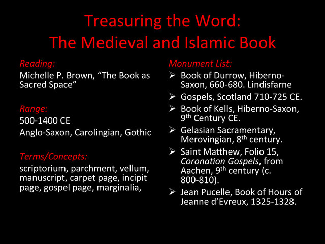 Reading: Michelle P. Brown, “The Book as Sacred Space” Range: 500-‐1400 CE Anglo-‐Saxon, Carolingian, Gothic Terms/Concepts: scriptorium, parchment, vellum, manuscript, carpet page, incipit page, gospel page, marginalia, Monument List: Ø Book of Durrow, Hiberno-‐ Saxon, 660-‐680. Lindisfarne Ø Gospels, Scotland 710-‐725 CE. Ø Book of Kells, Hiberno-‐Saxon, 9th Century CE. Ø Gelasian Sacramentary, Merovingian, 8th century. Ø Saint MaWhew, Folio 15, Corona7on Gospels, from Aachen, 9th century (c. 800-‐810). Ø Jean Pucelle, Book of Hours of Jeanne d’Evreux, 1325-‐1328.