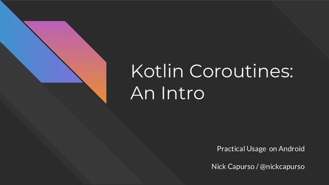 Slightly longer version given at a Meetup is also on Speaker Deck: https://speakerdeck.com/nickcapurso/introduction-to-kotlin-coroutines-for-asynchronous-programming-on-android