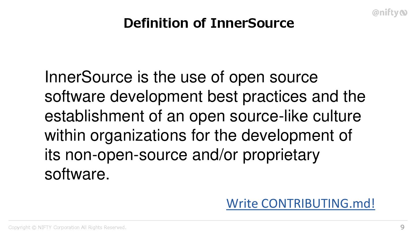 9 InnerSource is the use of open source software development best practices and the establishment of an open source-like culture within organizations for the development of its non-open-source and/or proprietary software. Write CONTRIBUTING.md!