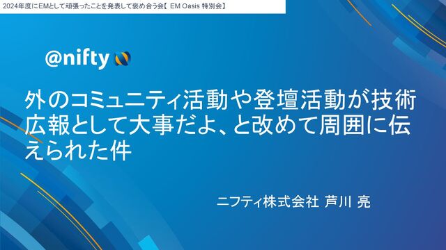 イベント 2024年度にEMとして頑張ったことを発表して褒め合う会【EM Oasis 特別会】 https://emoasis.connpass.com/event/349203/