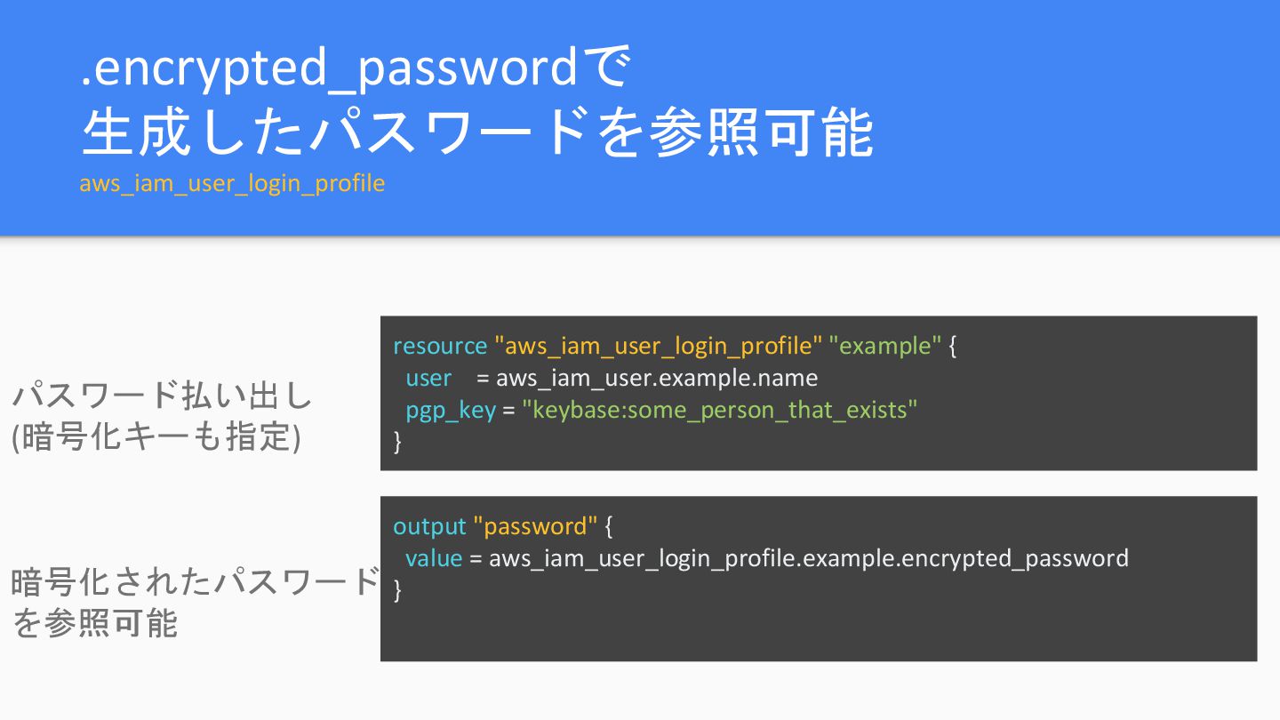 .encrypted_passwordで 生成したパスワードを参照可能 aws_iam_user_login_profile resource "aws_iam_user_login_profile" "example" { user = aws_iam_user.example.name